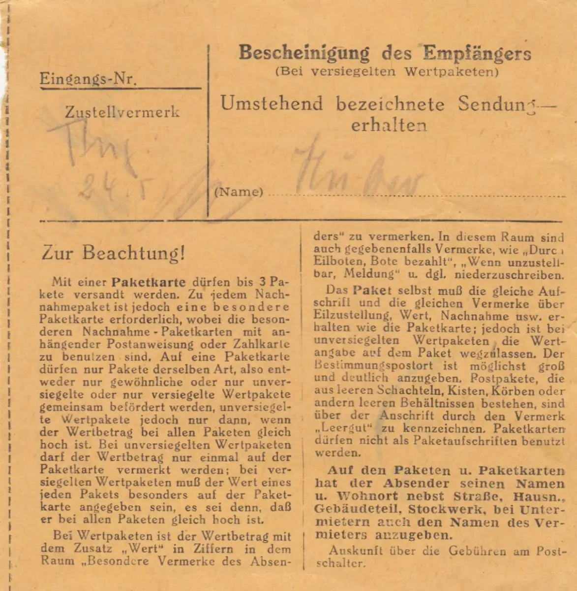 Carte de paquet 1948: Mindelheim selon Haar Obbay.