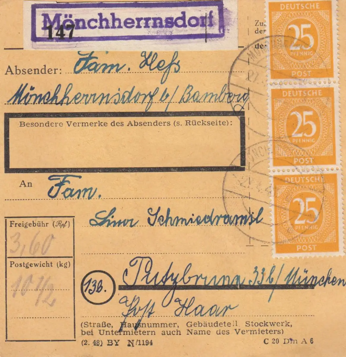 Carte de paquet 1948: Mönchherrnsdorf versPutzbrunn