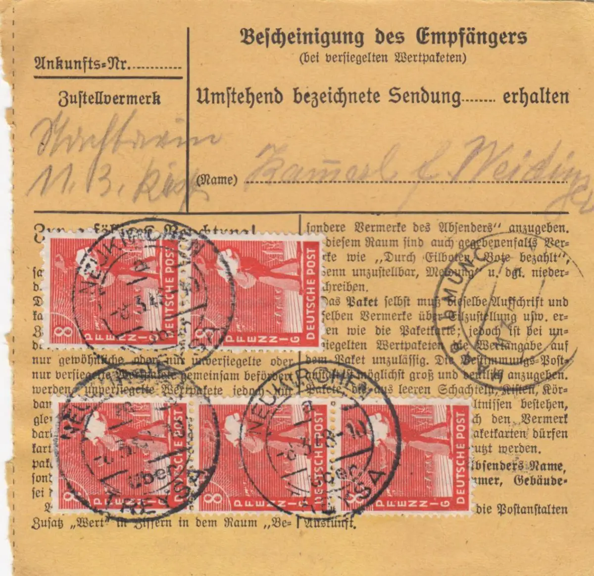 Carte de paquet 1948: laiterie Neukirchen par Haar, Auto-bookeur, carte de valeur