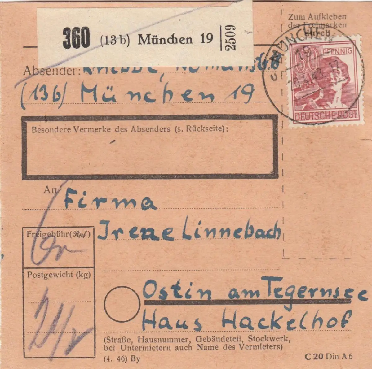 Carte forfait 1948: Munich 19 vers Ostin am Tegernsee, Haus Hackelhof