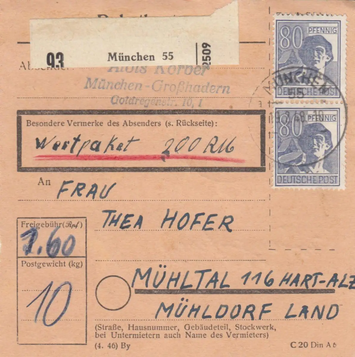 Carte de paquet 1948: Munich-Großhadern vers Mühltal, carte de valeur