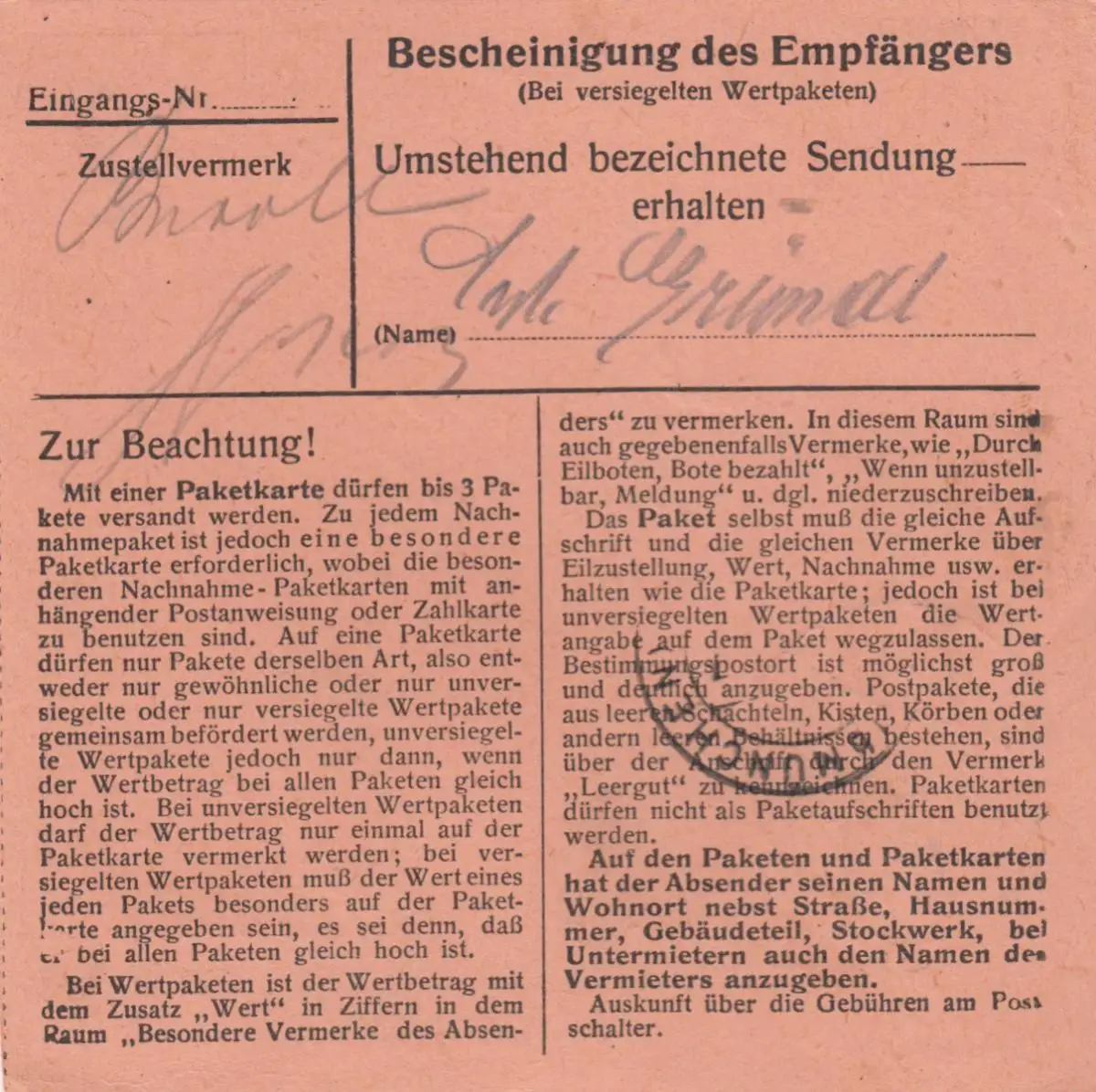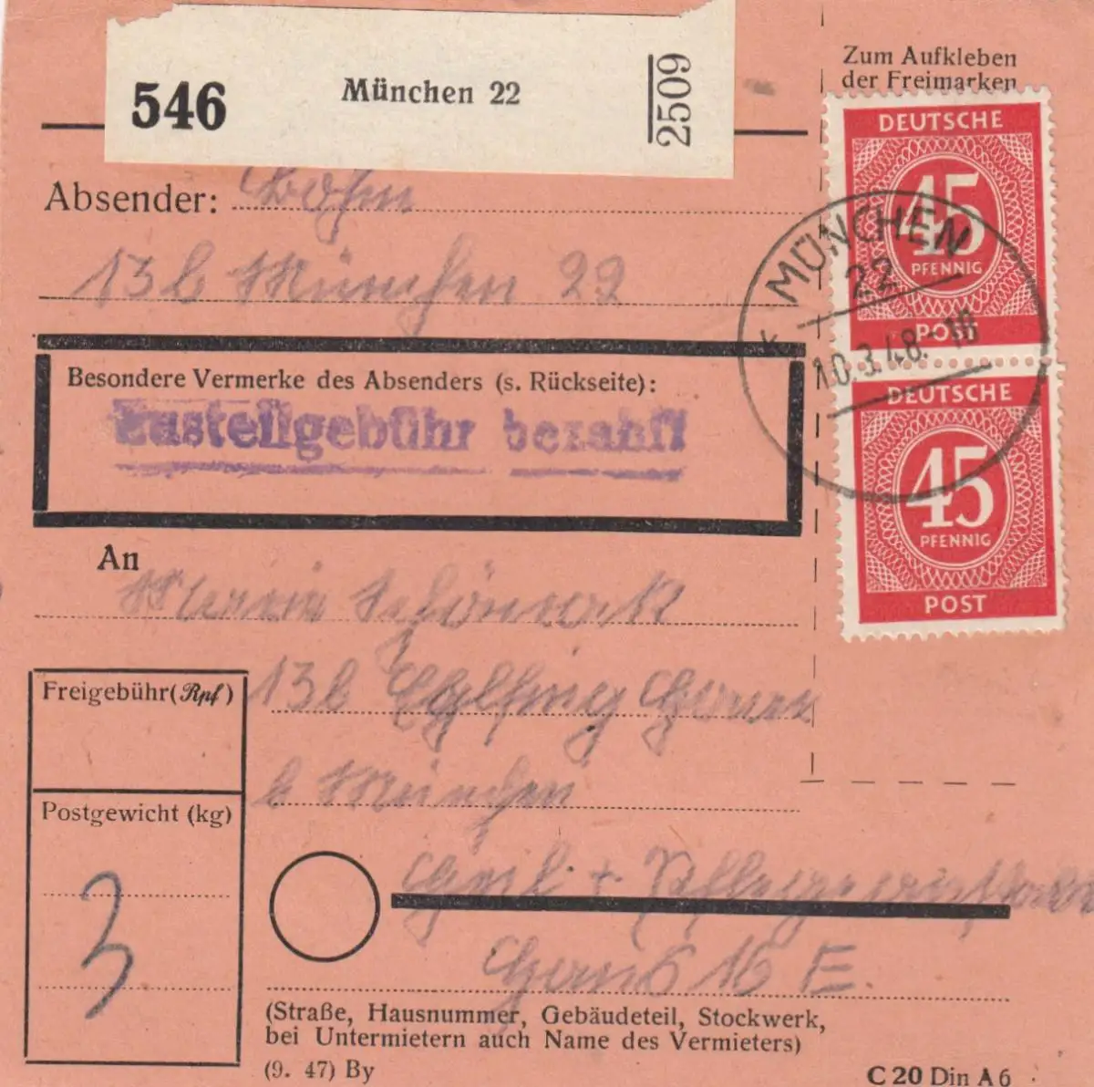 Carte de paquet 1948: Munich vers Eglfing, Heil- und Hübsanstalt