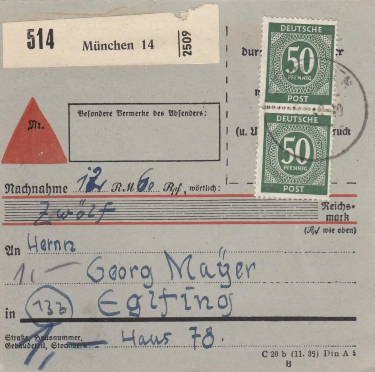 Carte de paquet 1948: Munich après Eglfing, Acceptation, Formulaire spécial