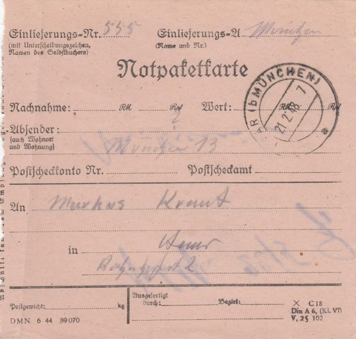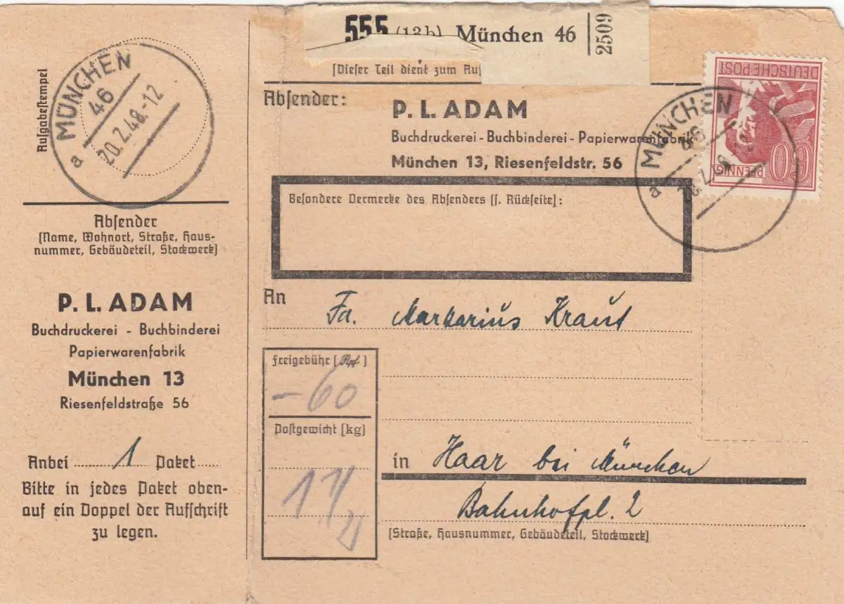 Carte de colis 1948: Munich après Haar, Auto-bookeur, avec carte de paquet d'urgence