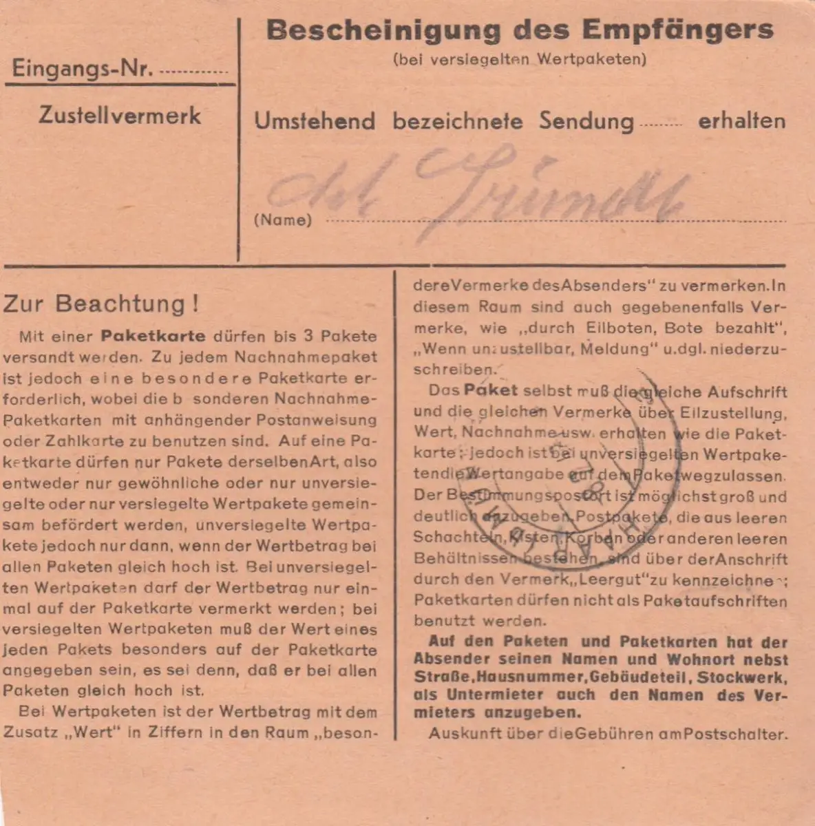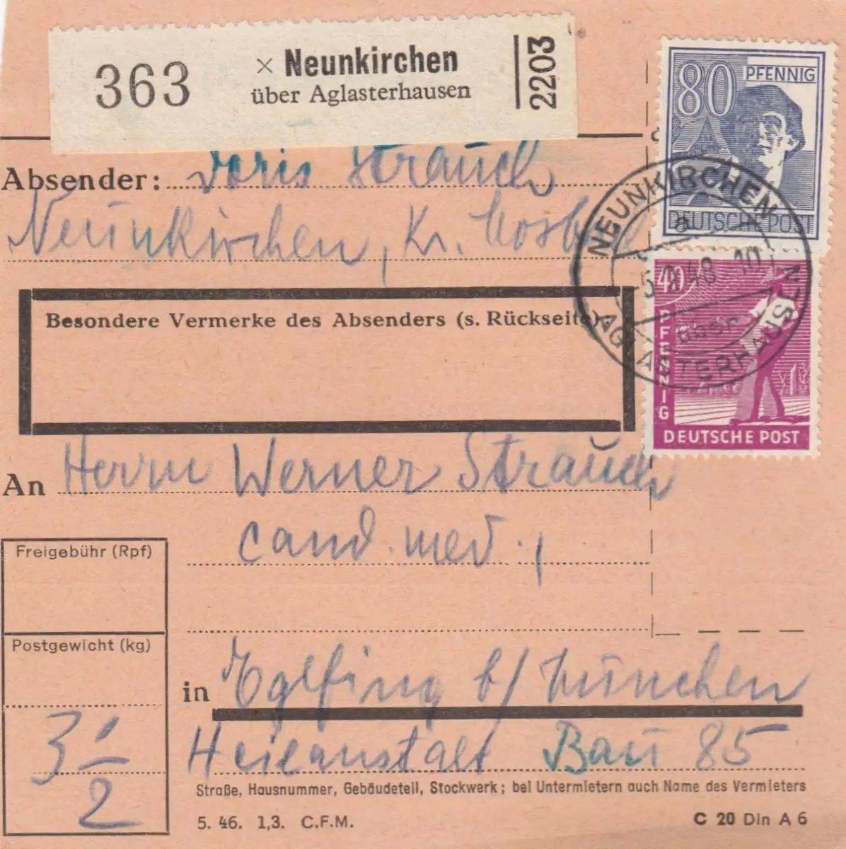 Carte de paquet 1948: Neunkirchen sur Aglasterhausen vers Eglfing