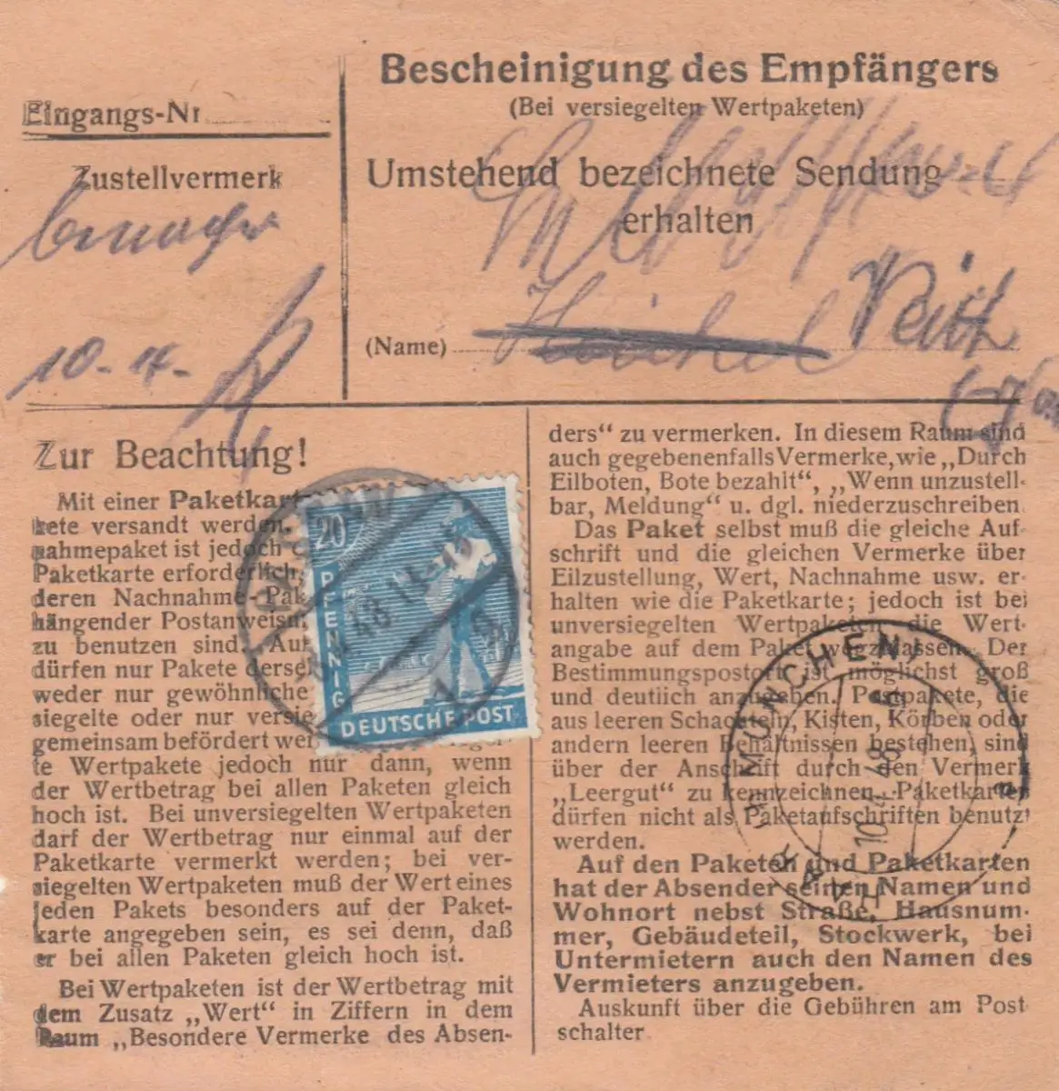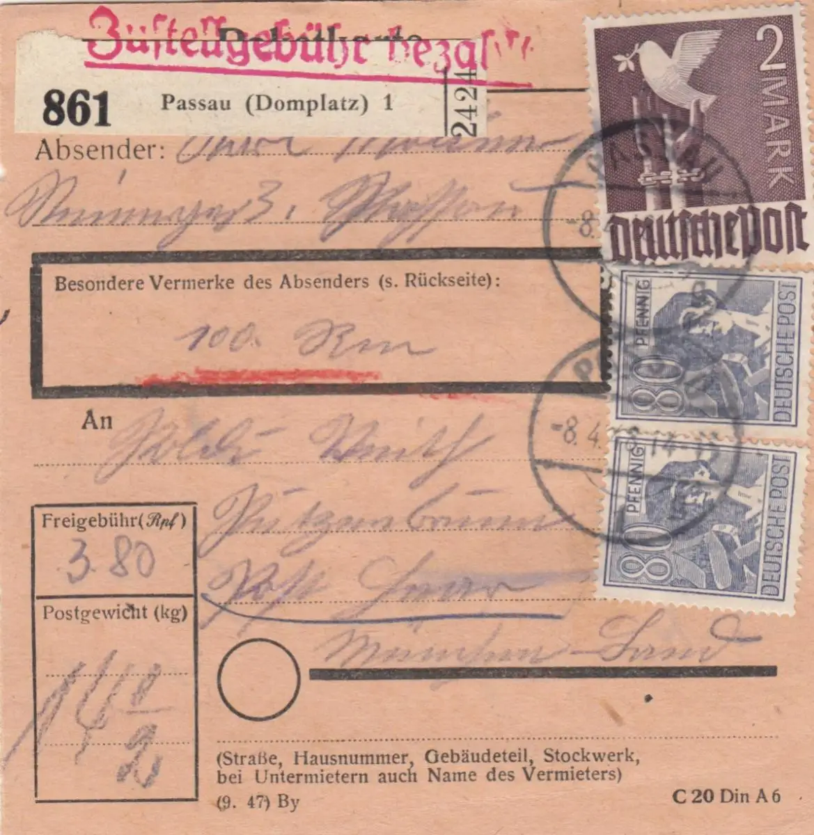 Carte de paquet 1948: Passau vers Putzbrunn, carte 100 RM
