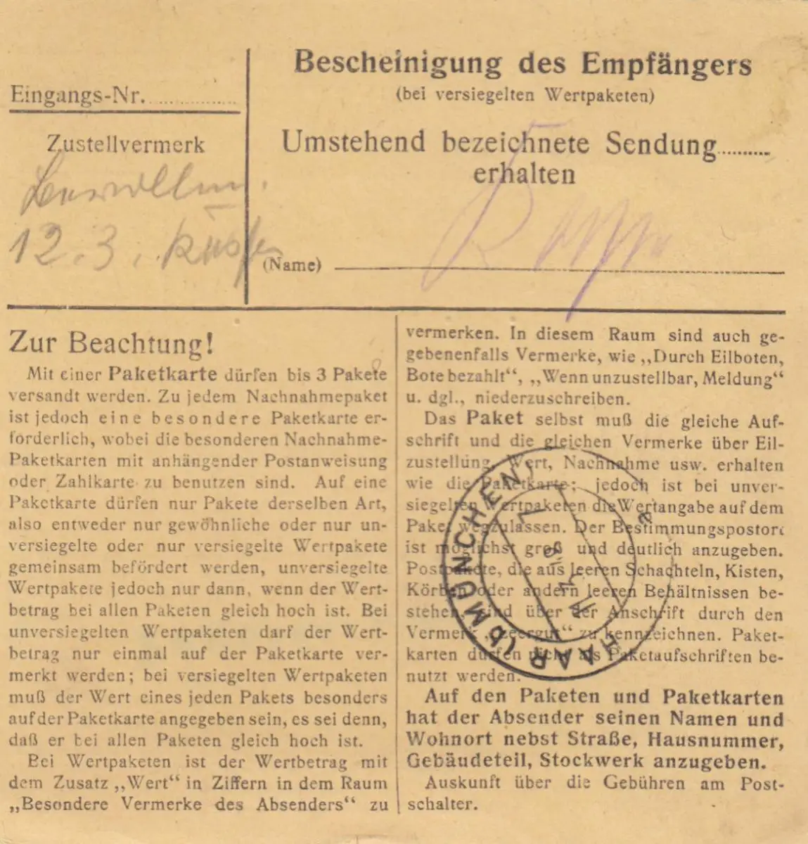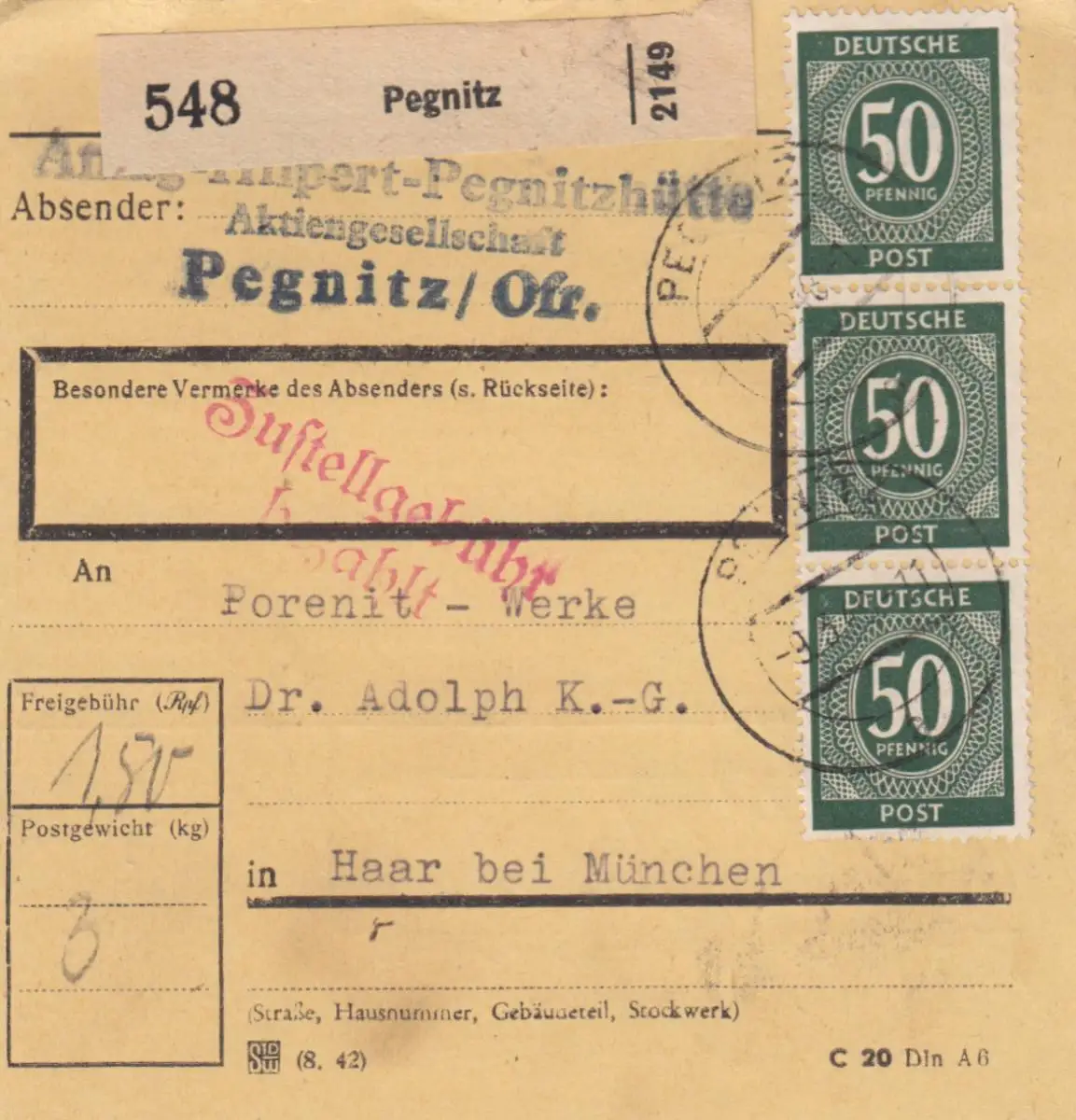 Carte de paquet 1948: Pegnitzhütte AG à Pegburgh après Haar