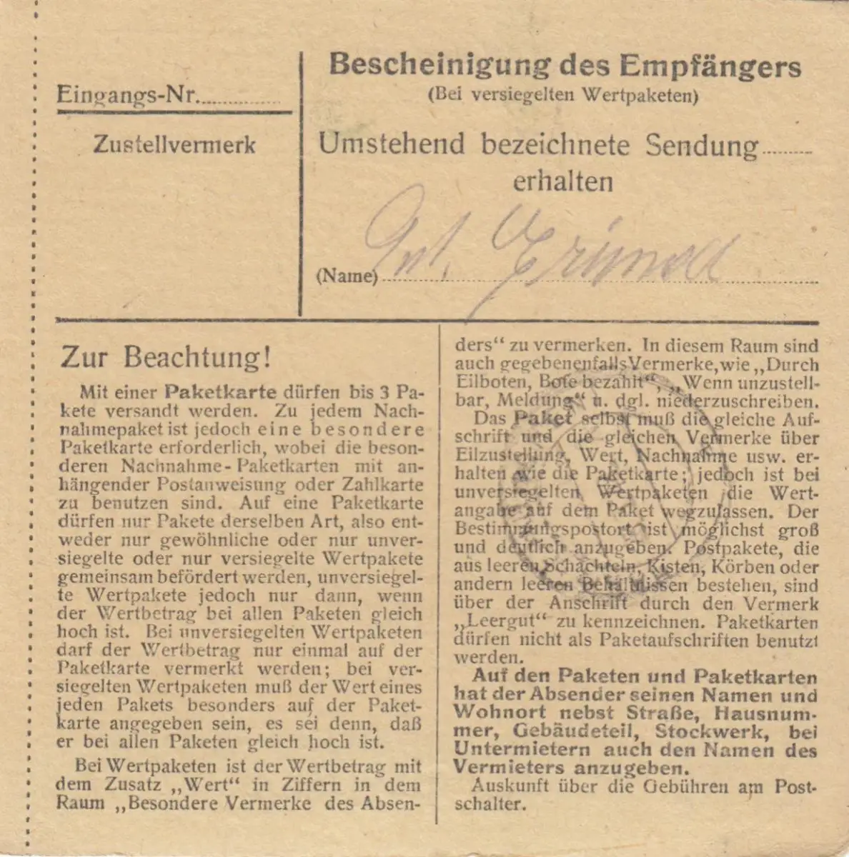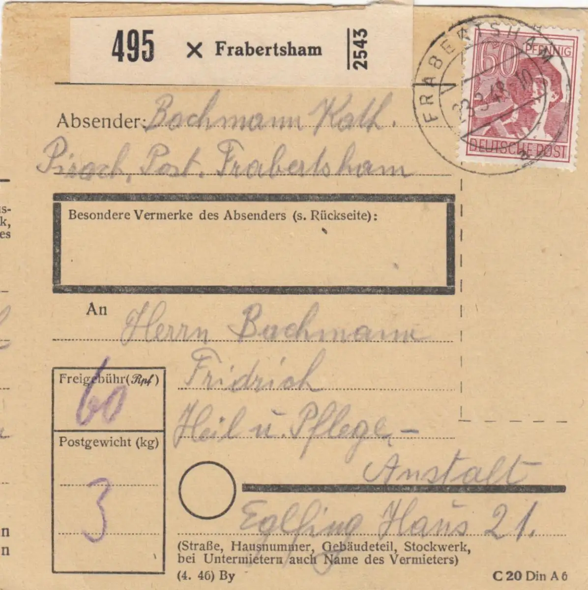 Carte de paquet 1948: Pirach Frabertsham d'après Eglfing, asile