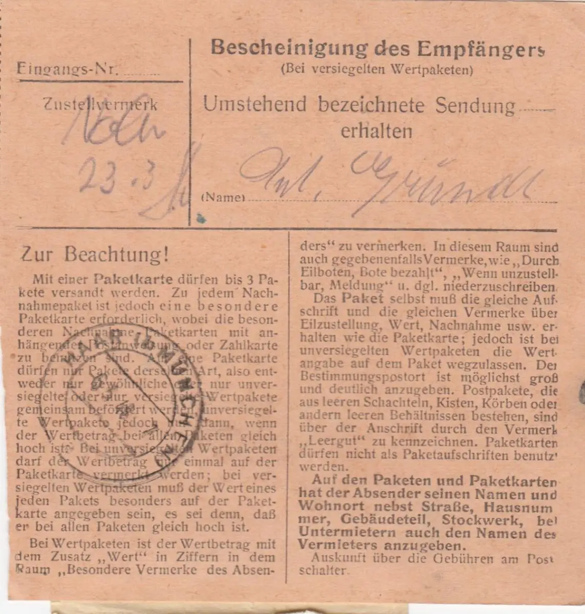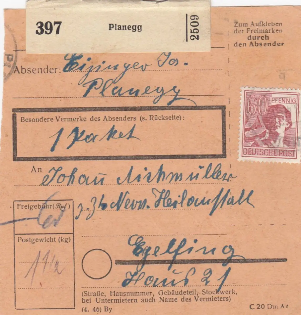 Carte de paquet 1948: Planegg près d'Egelfing, Nerfsanstalt, 1 paquet