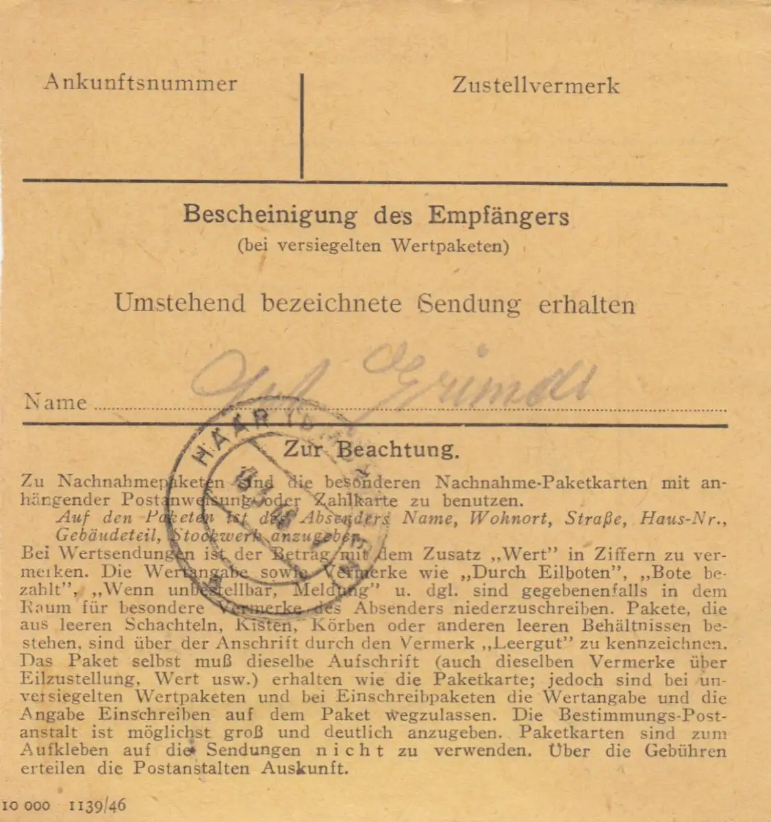Carte de paquet 1948: Redenfelden, usines de pâte à papier d'après Eglfing, Auto-booker