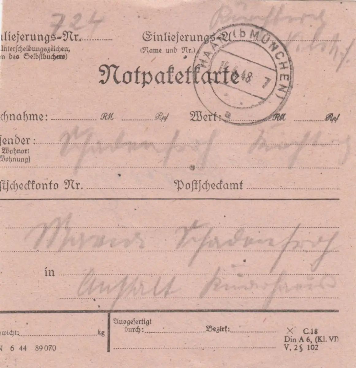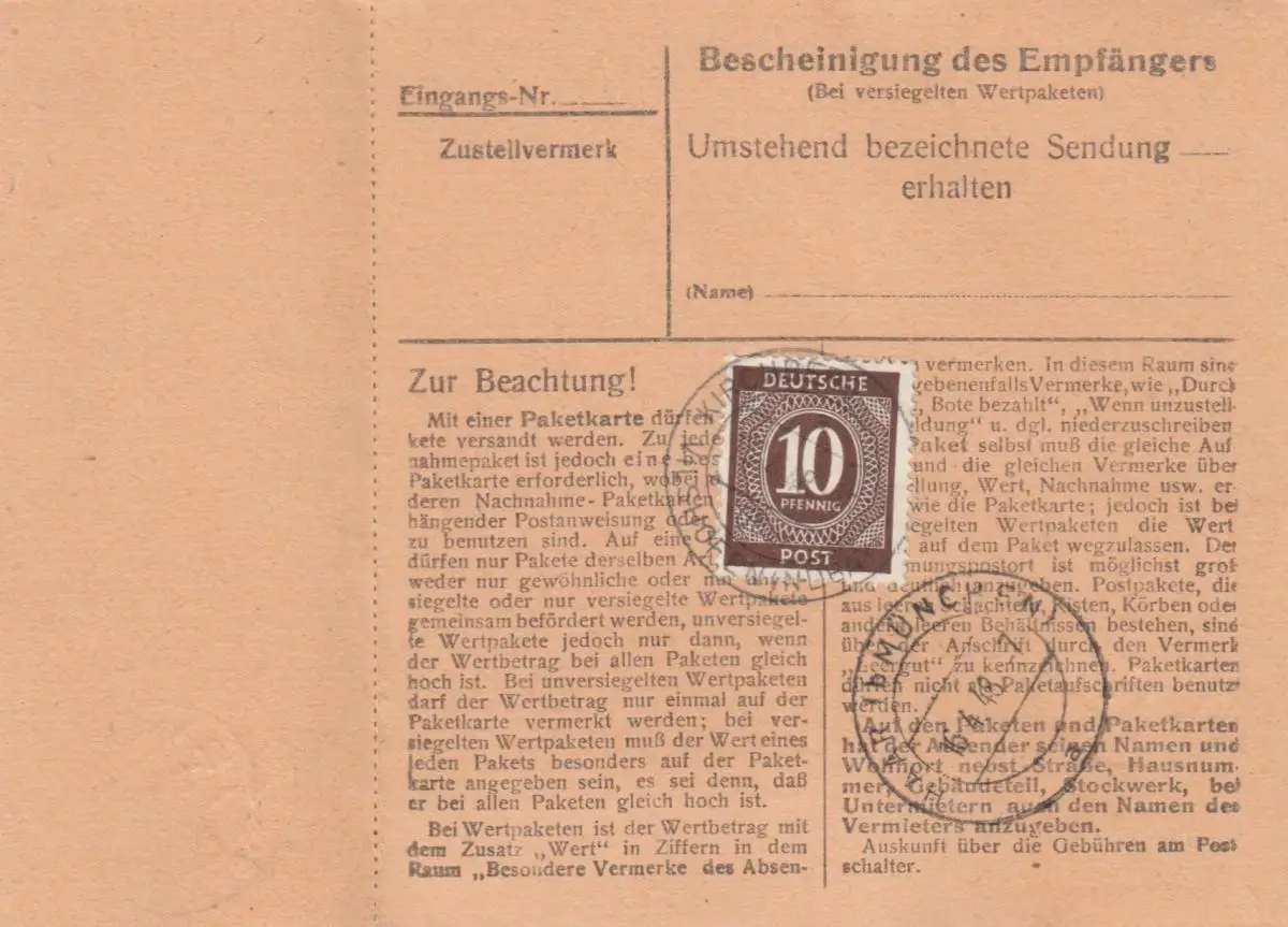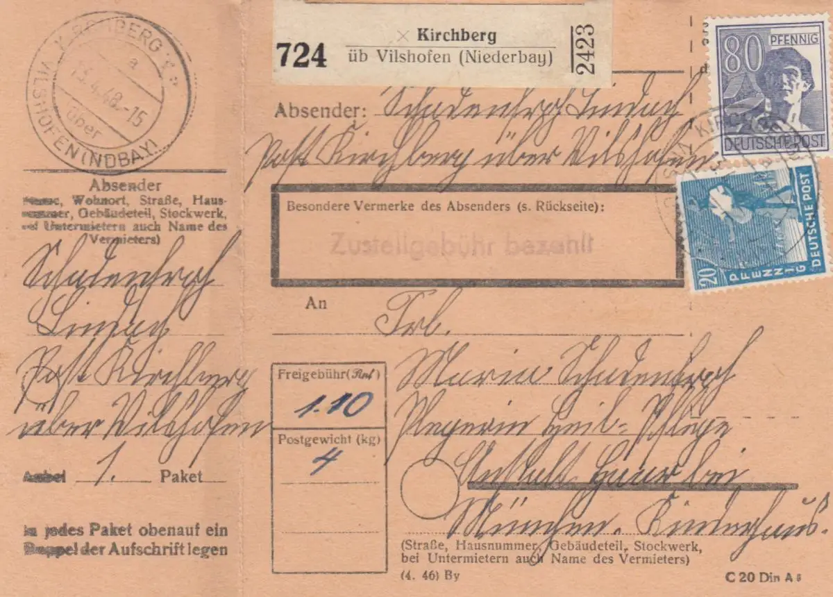 Carte de paquet 1948: Vergelsberg Kirchberg n. Haar, avec carte de colis d'urgence