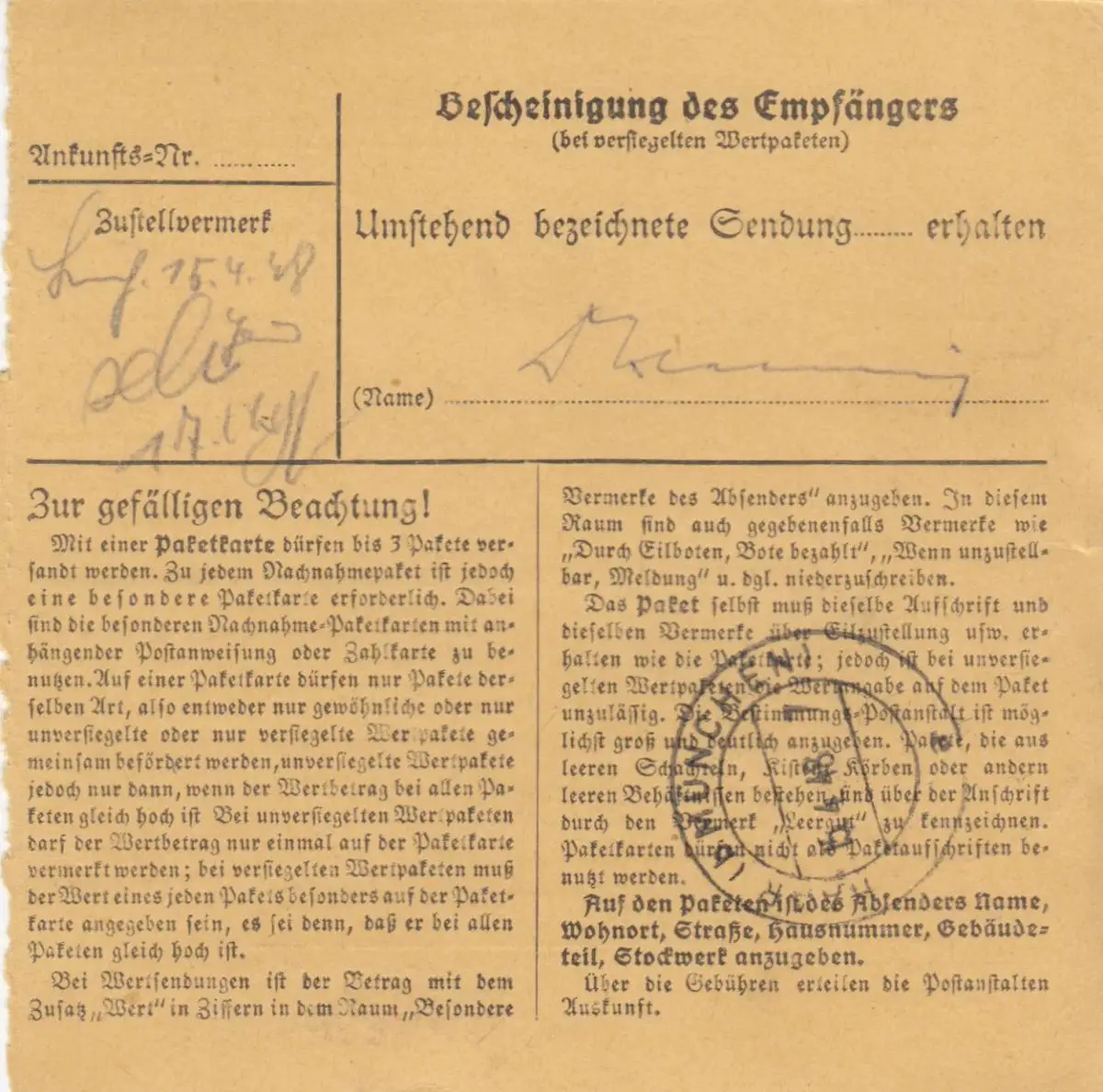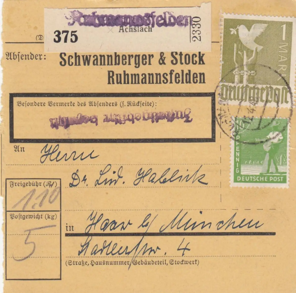 Carte de paquet 1948: Ruhmannsfelden Achslach n. Cheveux, Auto-bookeur