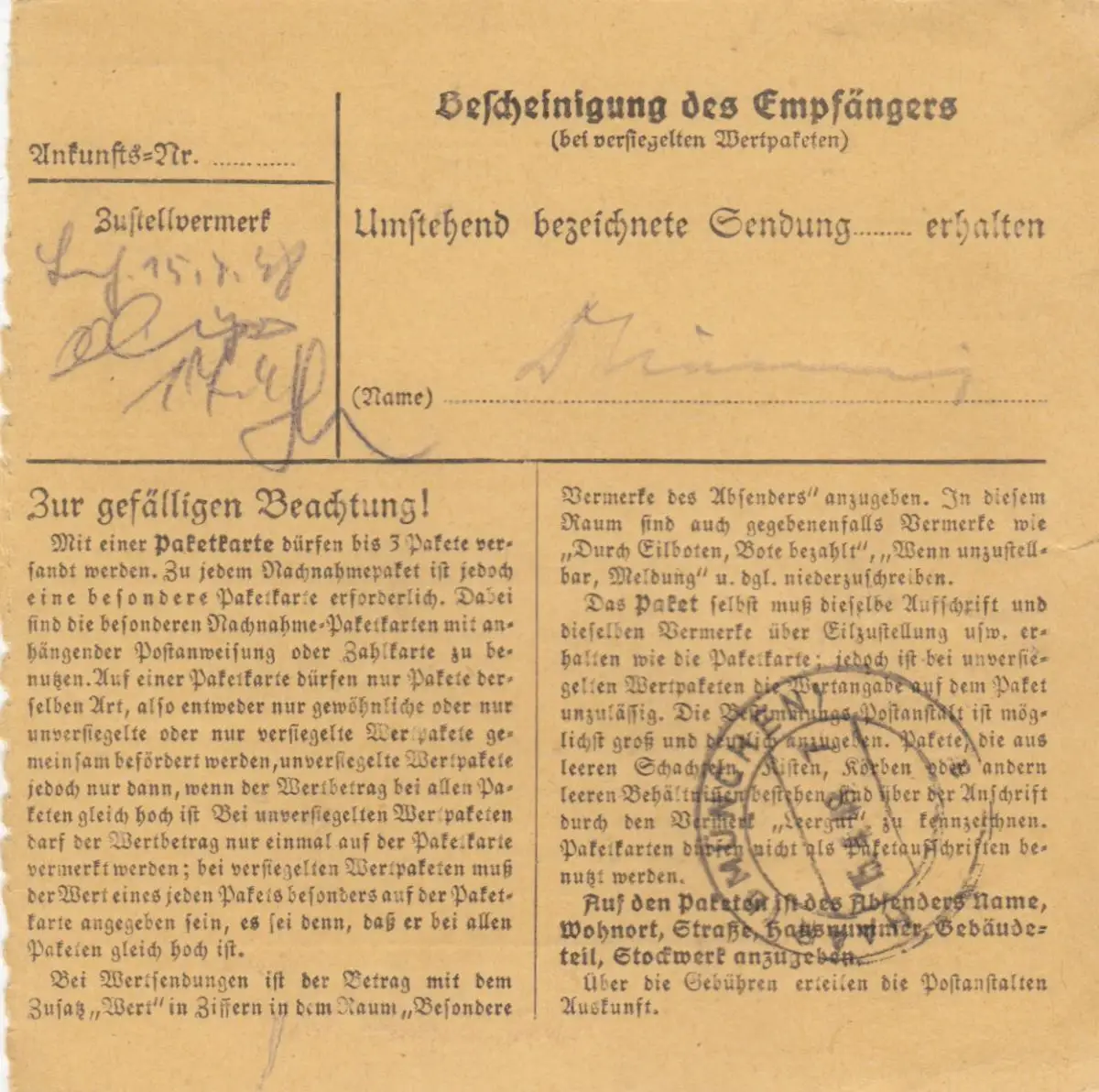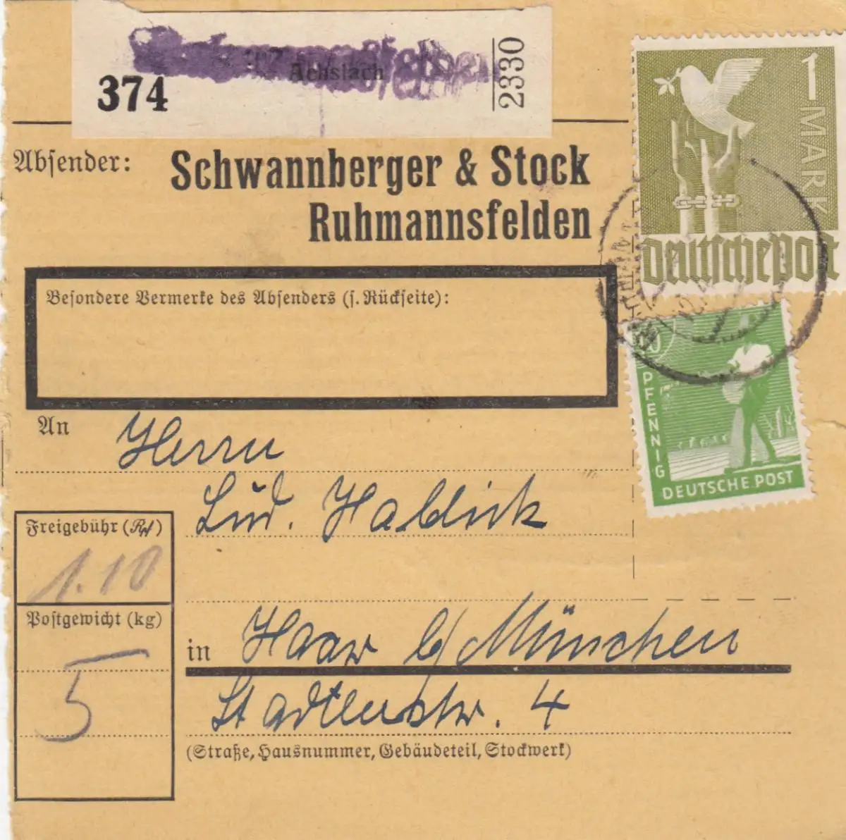 Carte de paquet 1948: Ruhmannsfelden, Schwannberger + Stock, Auto-booker