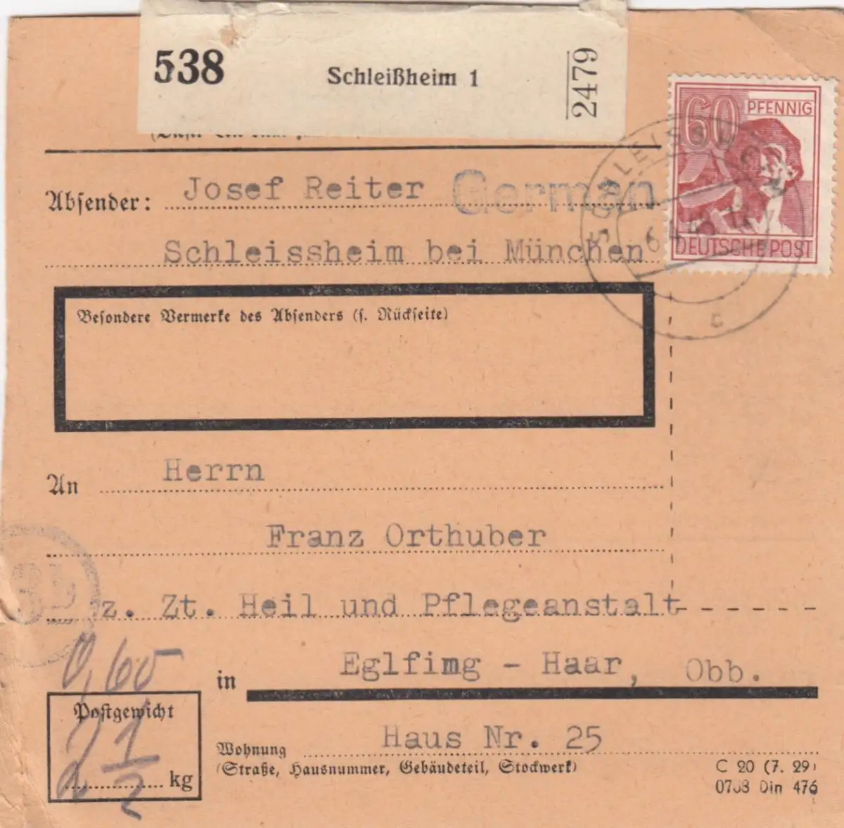 Carte de paquet 1948: Schleidsheim vers Eglfing, centre de soins et de santé