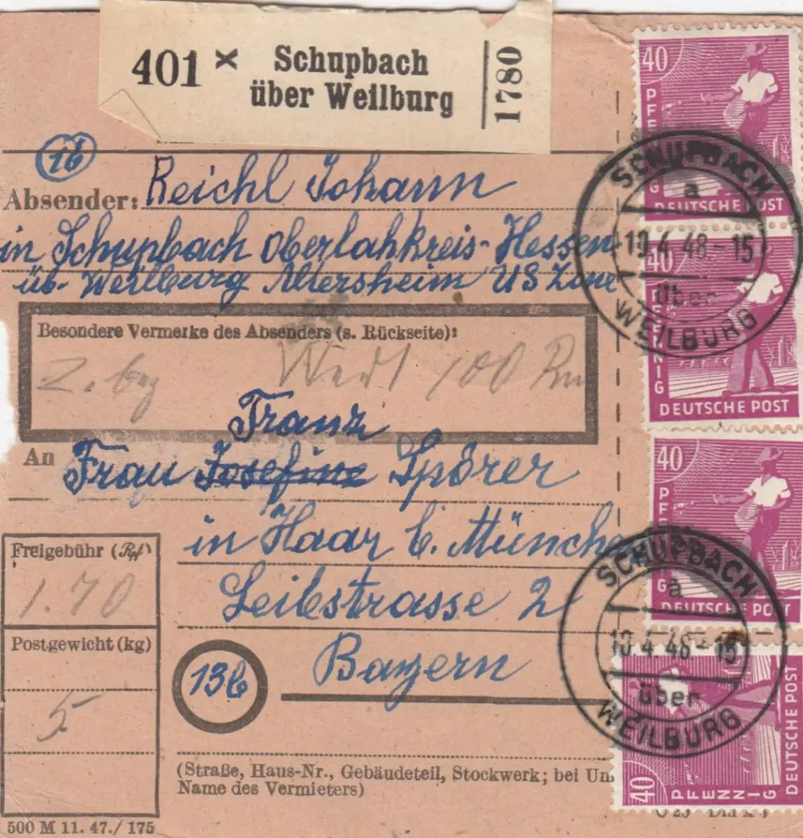 Carte de paquet 1948: Schupach Oberlahnkreis par cheveux, carte de valeur