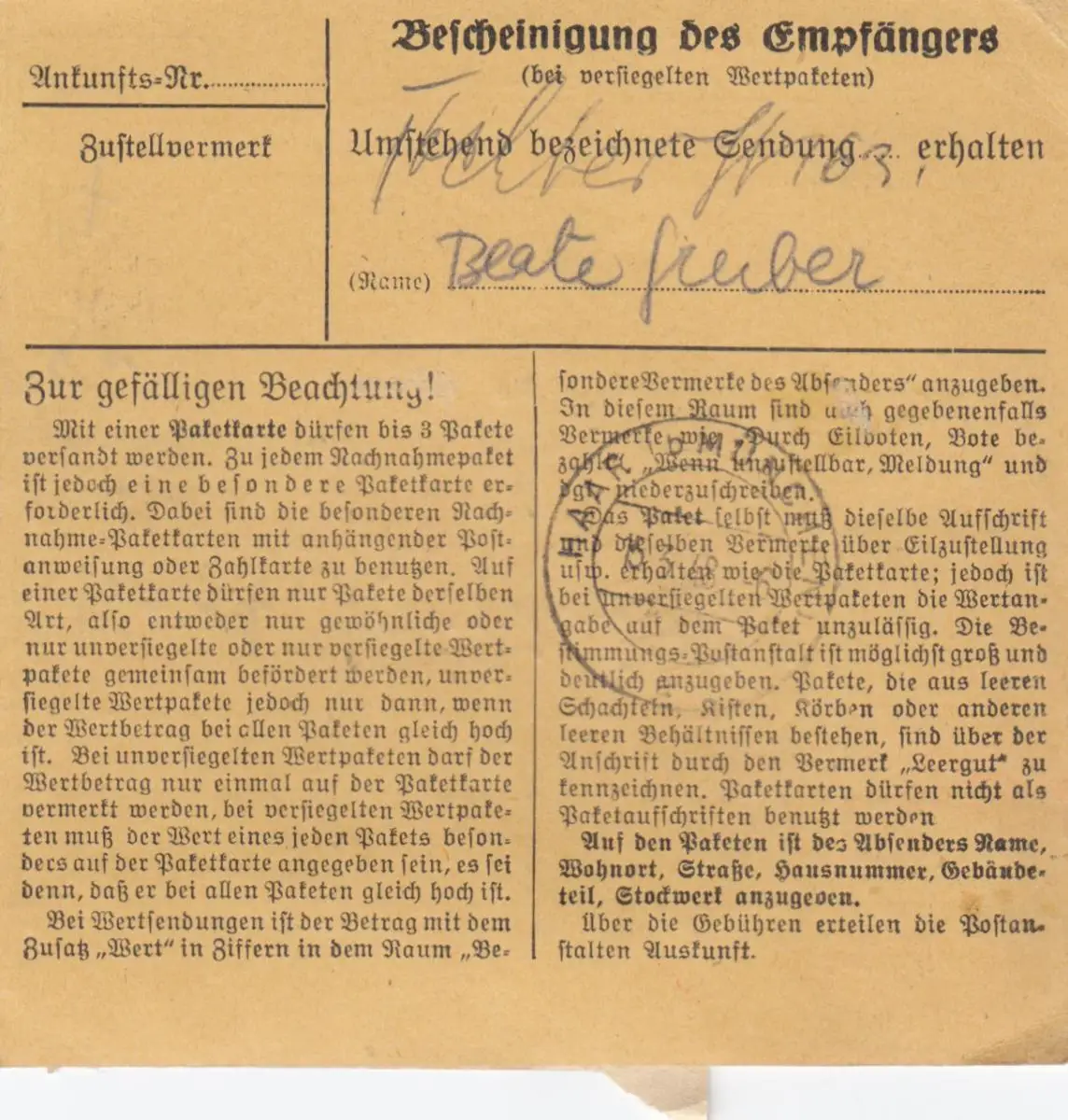 Carte de paquet 1948: Sielenbach par Haar, carte de valeur