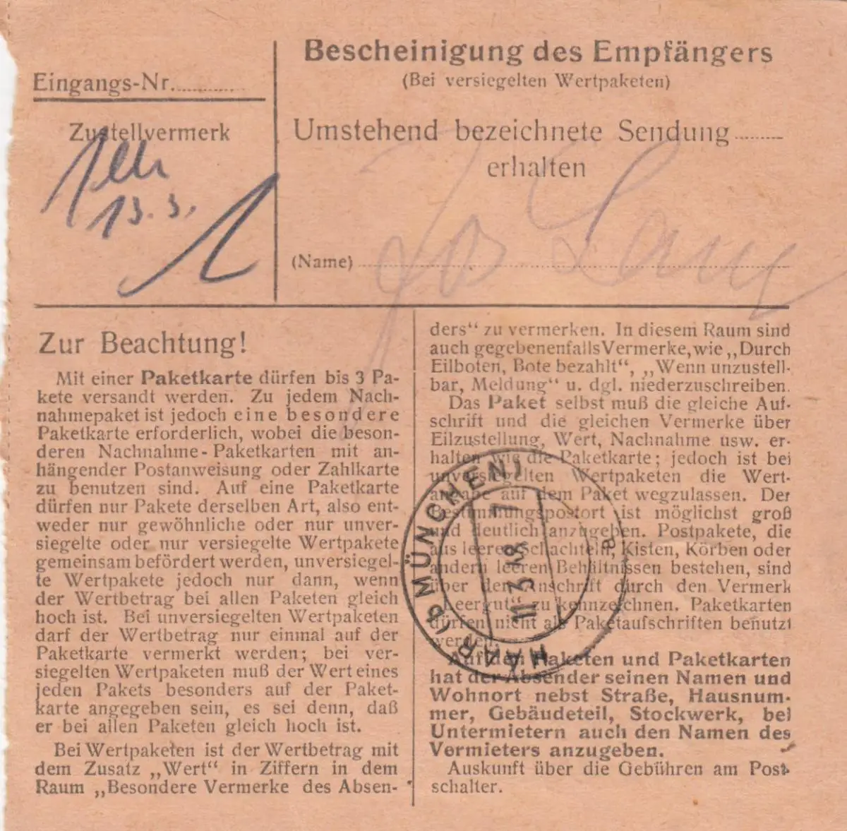 Carte de paquet 1948: Pierre Traun par cheveux, carte de valeur