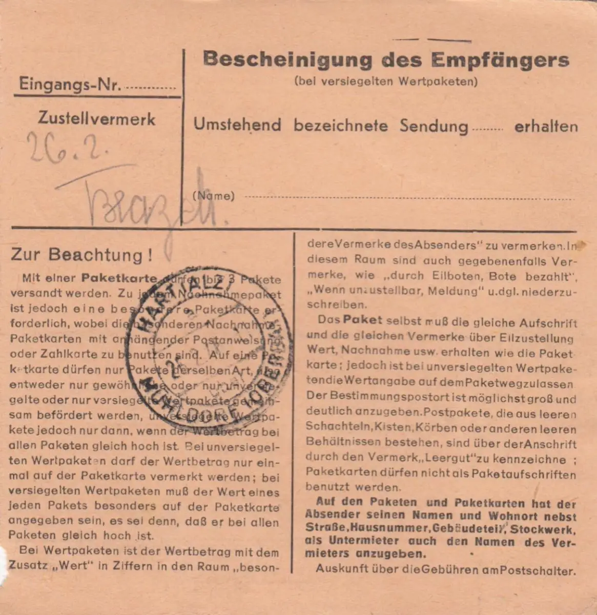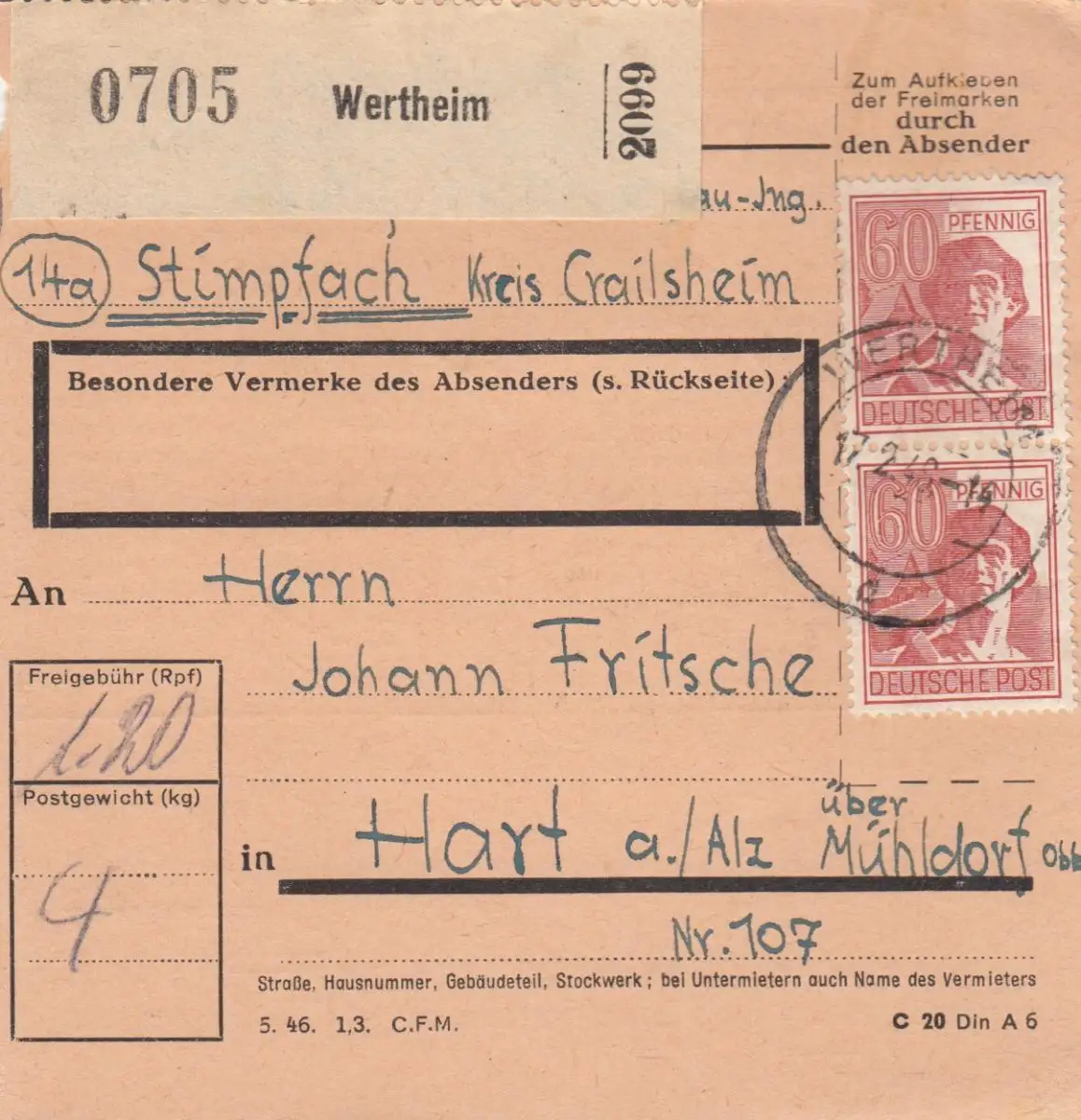 Carte de paquet 1948: Stimpfach Kreis Crailsheim vers Hart via Mühldorf