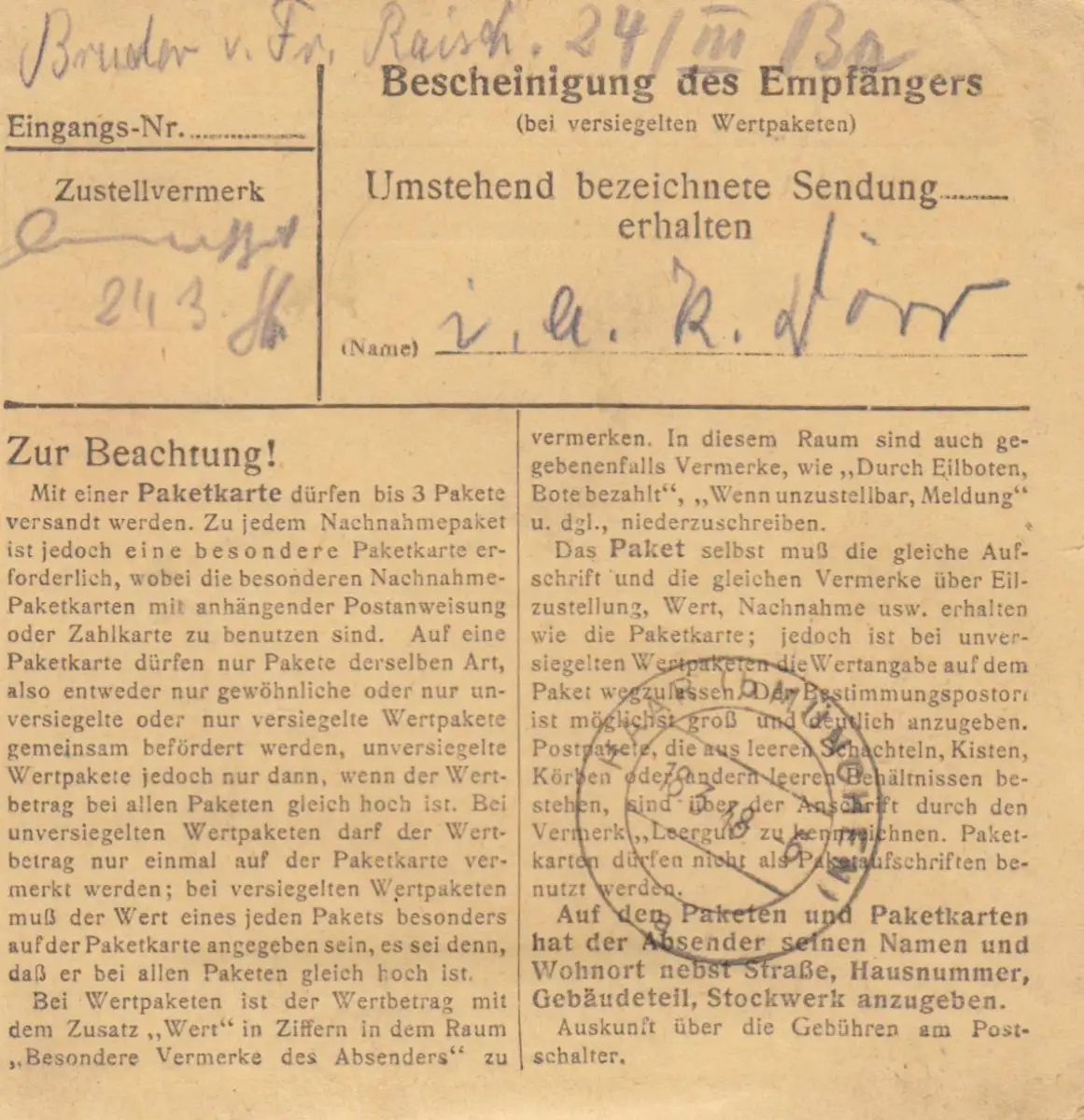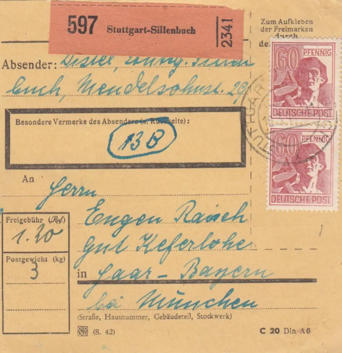 Carte de paquet 1948: Livret de Stuttgart vers Keferloh