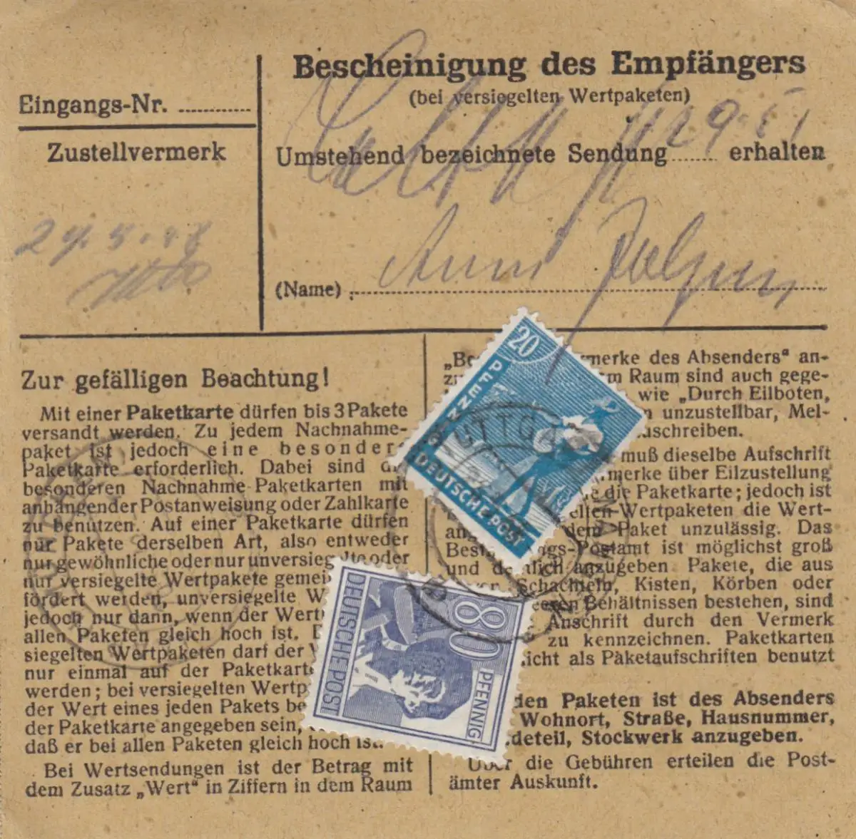 Carte de paquet 1948: Wangen de Stuttgart par Haar, carte de valeur