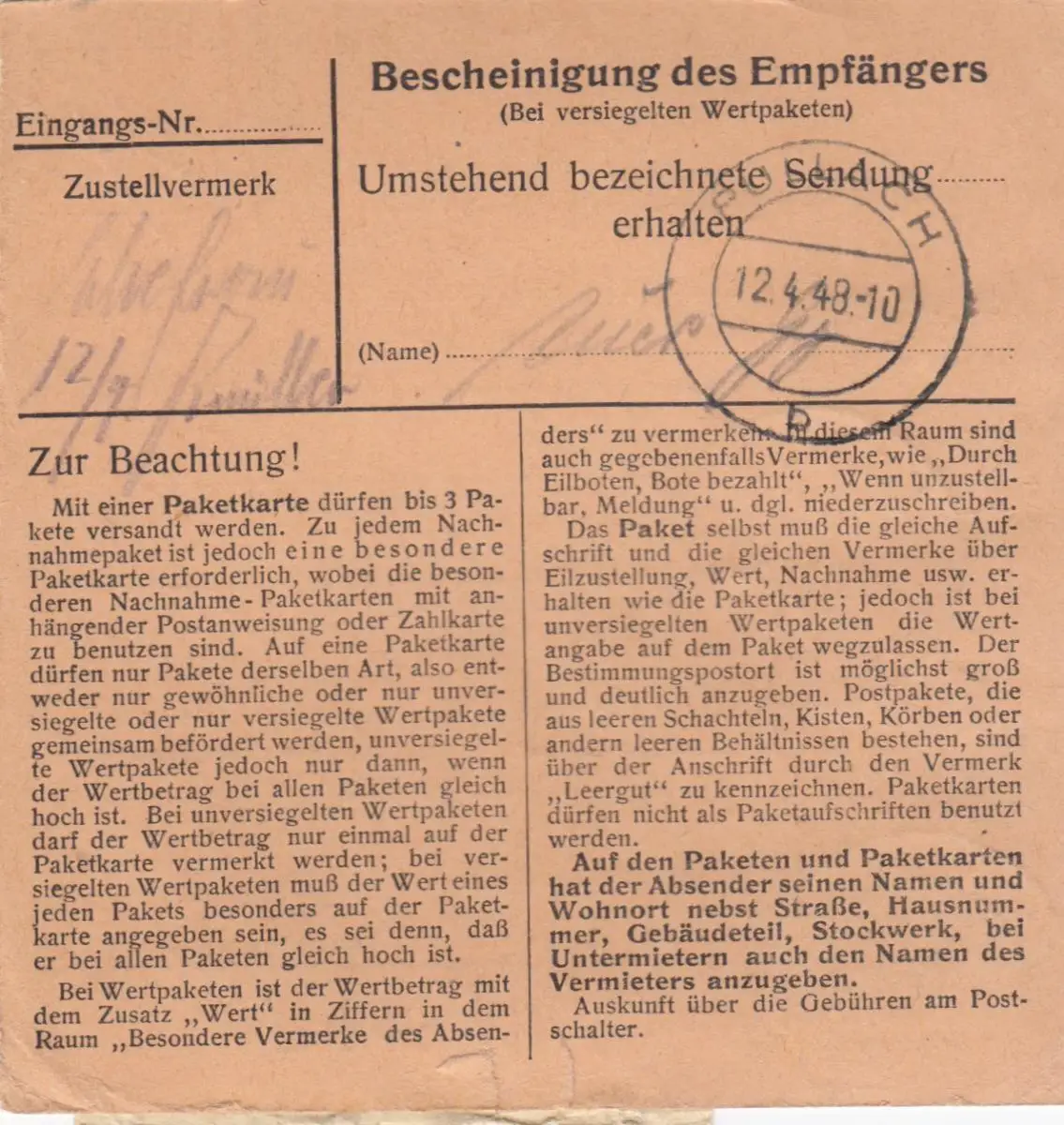 Carte de paquet 1948: Tann Niederbay. après Pullach, carte de valeur