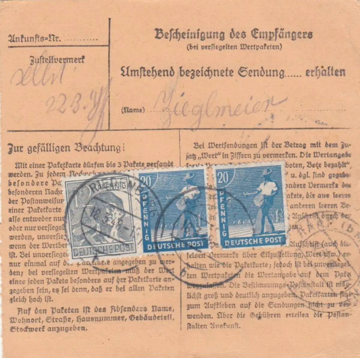 Carte de paquet 1948: Thann Riedenburg, Pondorf vers Putzbrunn, carte de valeur