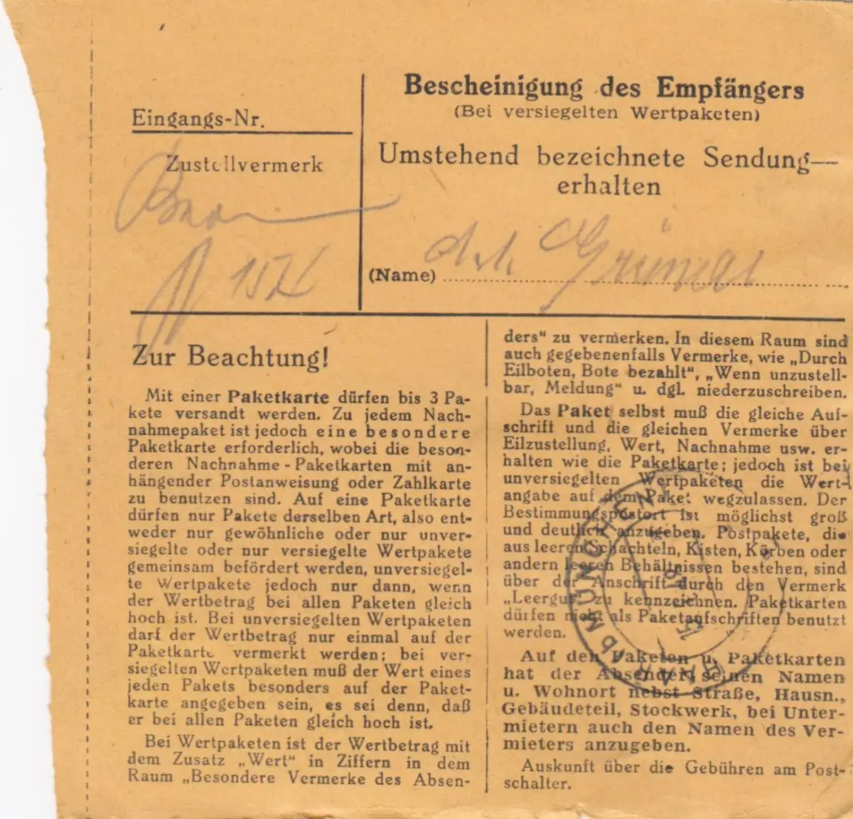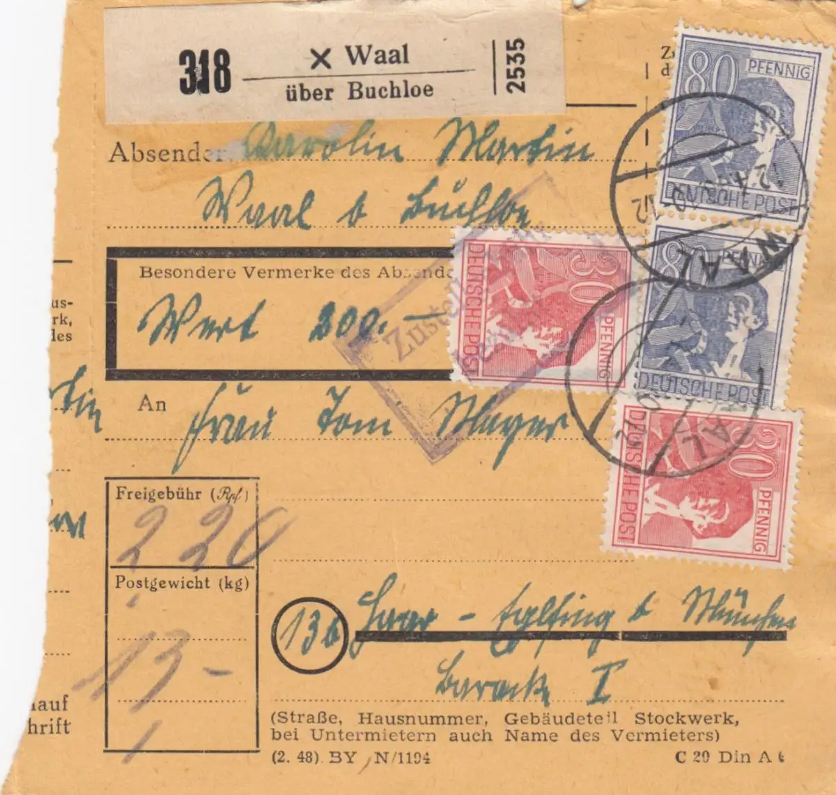 Carte de paquet 1948: Waal sur Buchloe par cheveux, carte de valeur