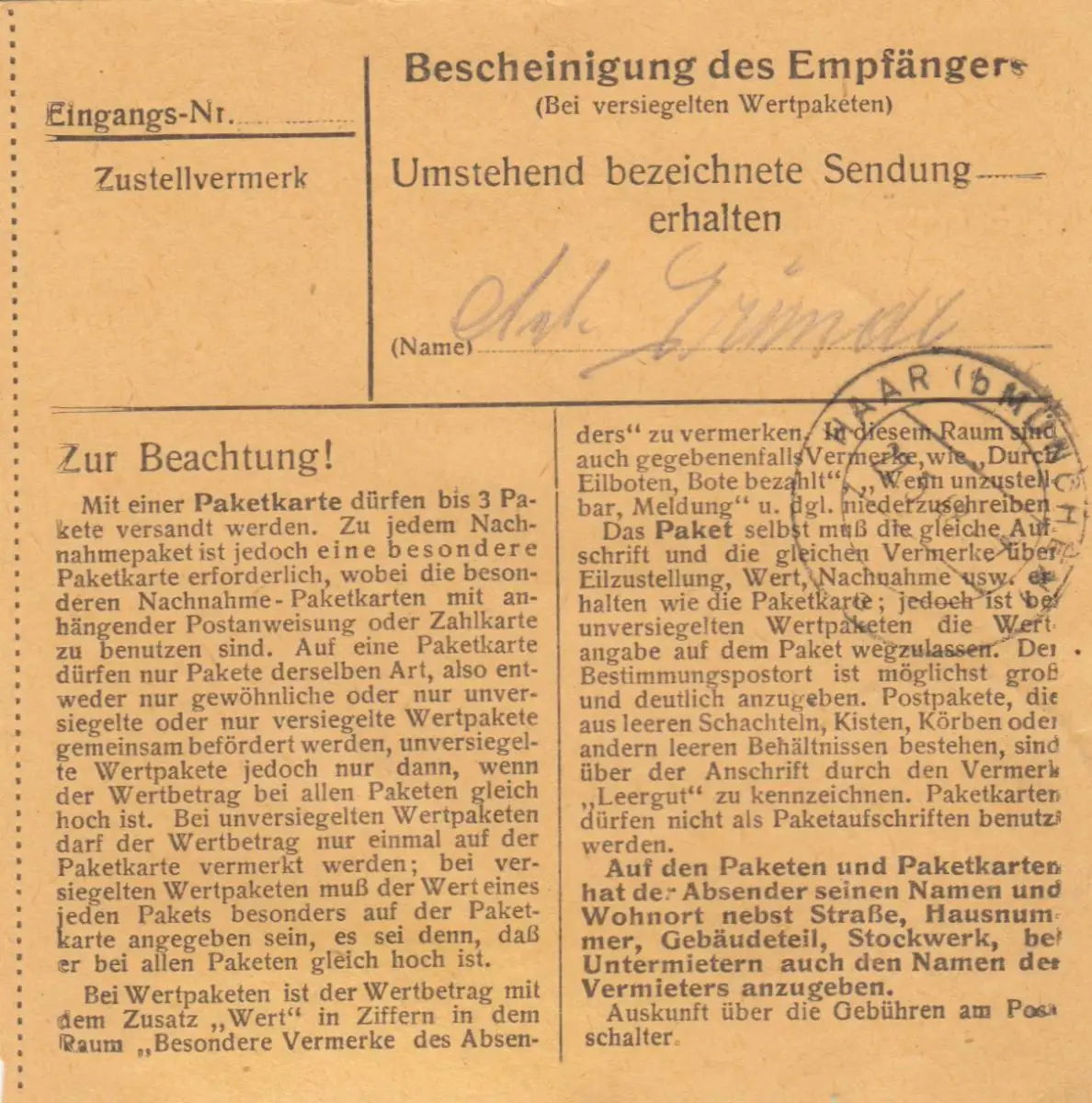 Carte de paquet 1948: Forêt de Mühldorf à Haar, asile de cure
