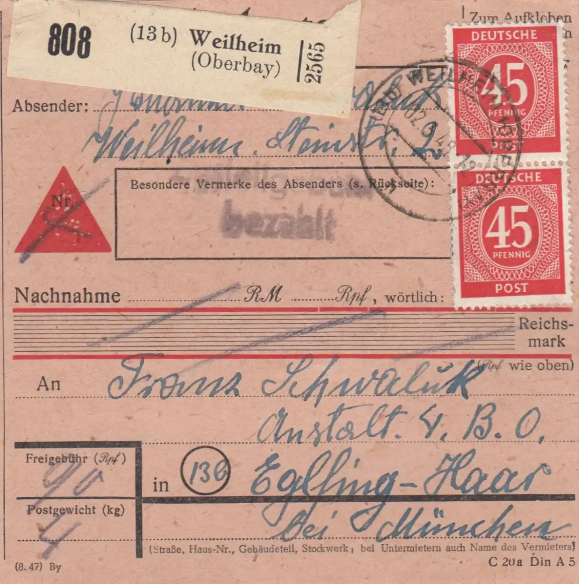 Carte de paquet 1948: Weilheim Oberbay. après Eglfing, établissement, rachat