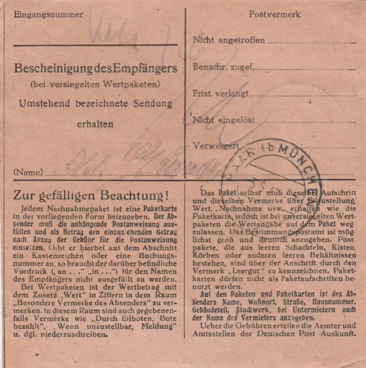 Carte de paquet 1948: Weilheim à Haar, établissement, remboursement