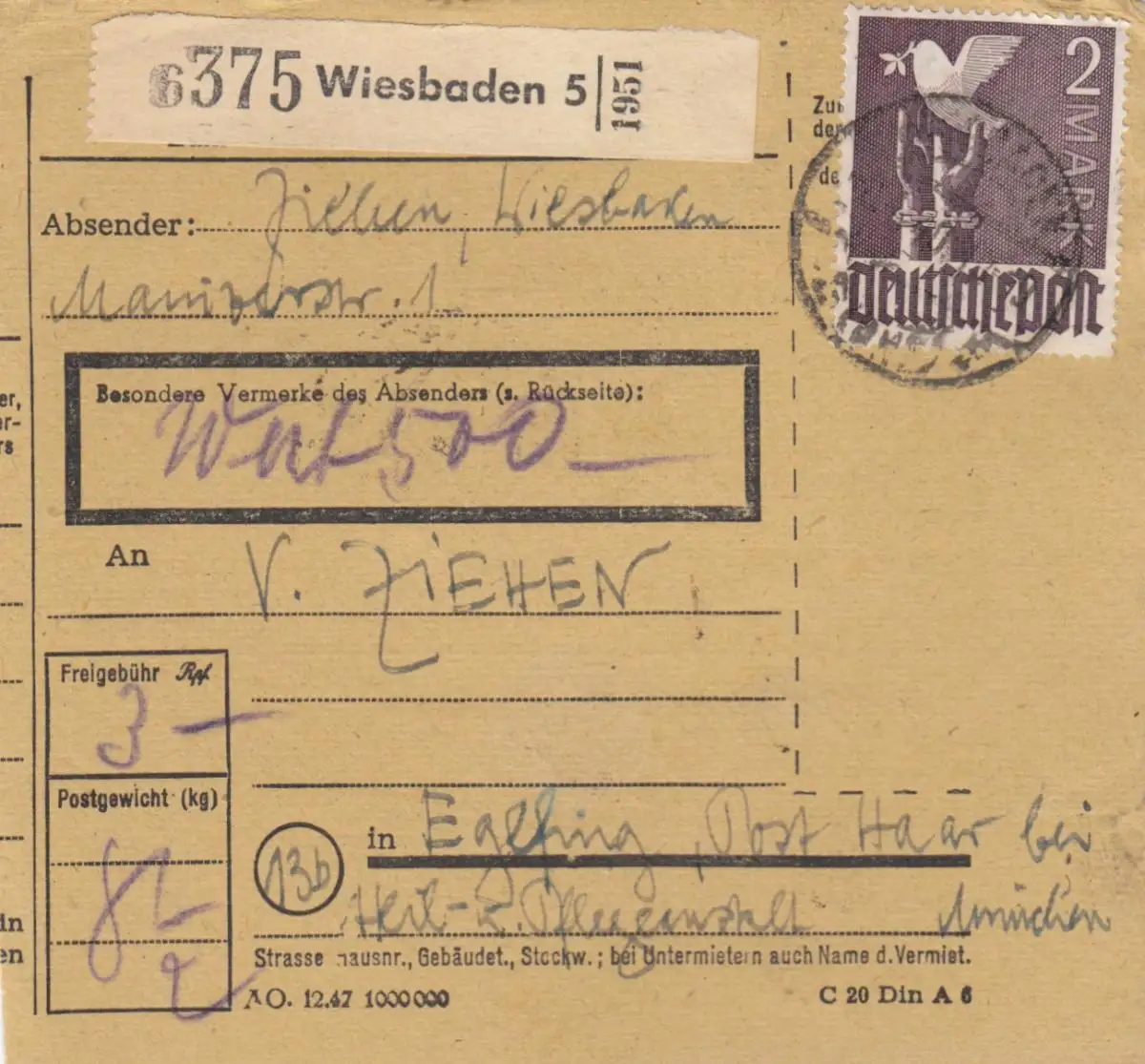 Carte de paquet 1948: Wiesbaden d'après Eglfing, établissement, carte de valeur