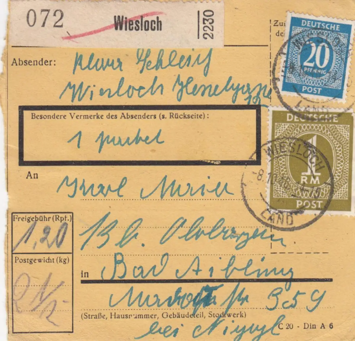 Carte de paquet 1948: Wiesloch d'après Bad Aibling