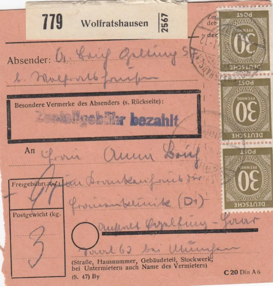 Carte de paquet 1948: Wolfratshausen a Eglfing Haar