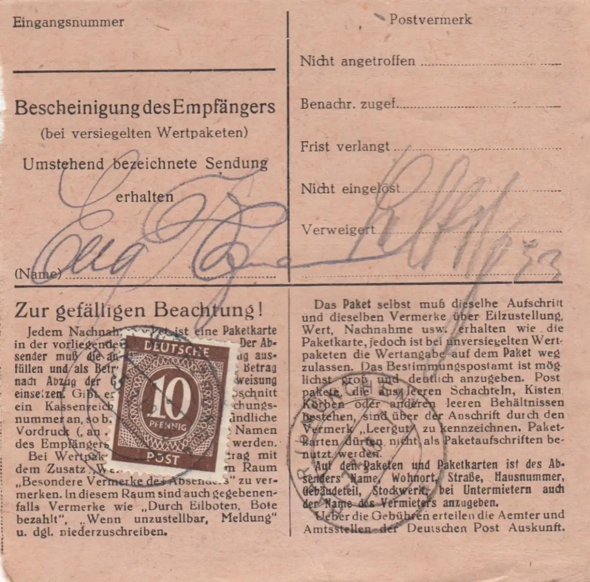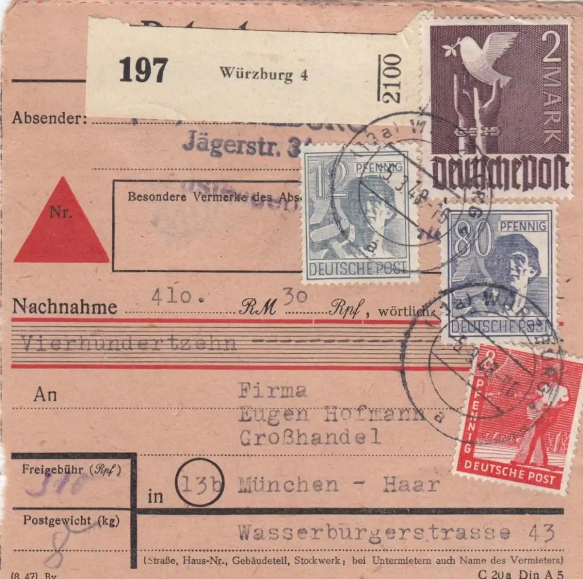 Carte de paquet 1948: Würzburg 4 par cheveux, gros, réduction