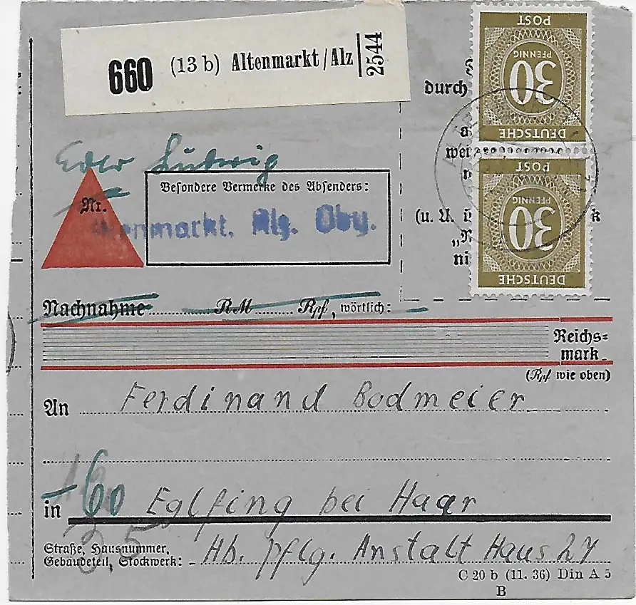 Carte de colis Altenmarkt/Alz, prise en charge après Eglfing 1948, MeF