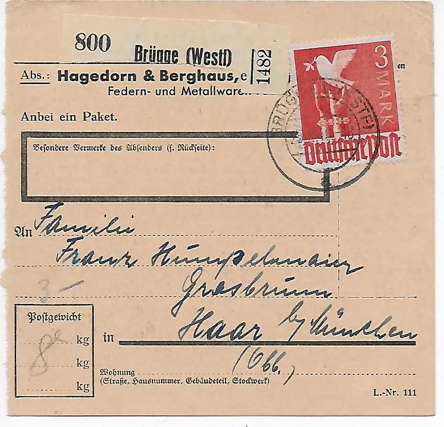 Carte de colis Bruges/Westf. par Haar, 1948, EF