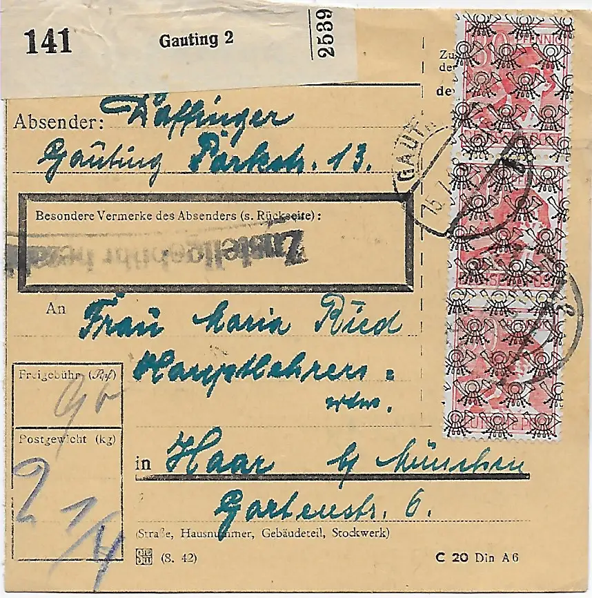 Carte de paquet Gauting après cheveux, 1948, MeF