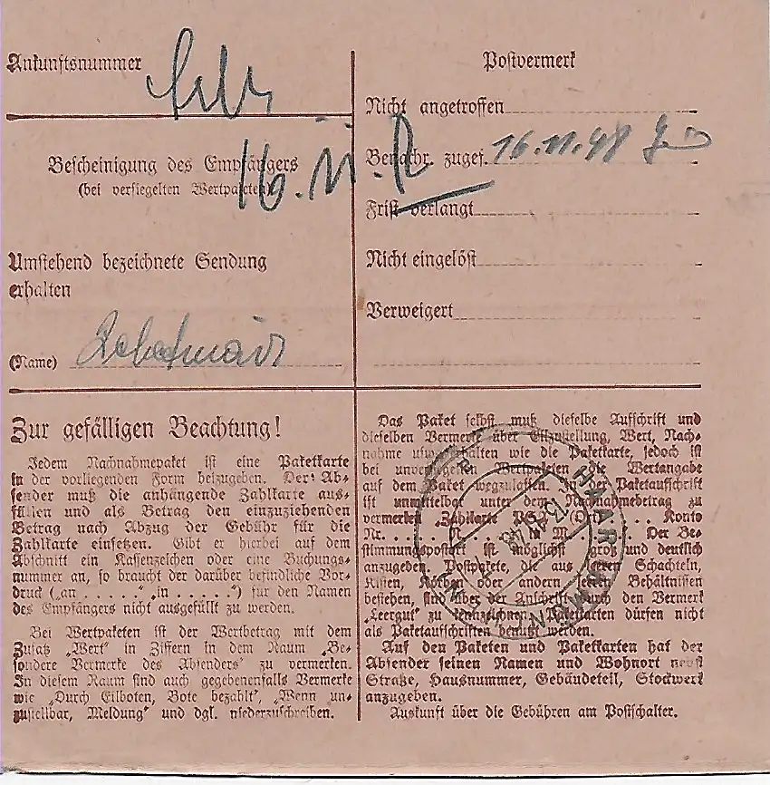 Carte de colis Acceptation Solingen Forêt par Haar/Munich, 1948, Mi Nr. 93 MeF