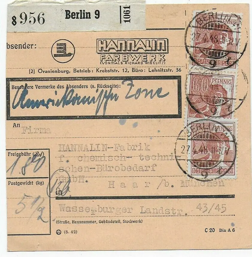 Carte de paquet Oranienburg/Berlin après Haar, 1948, MeF