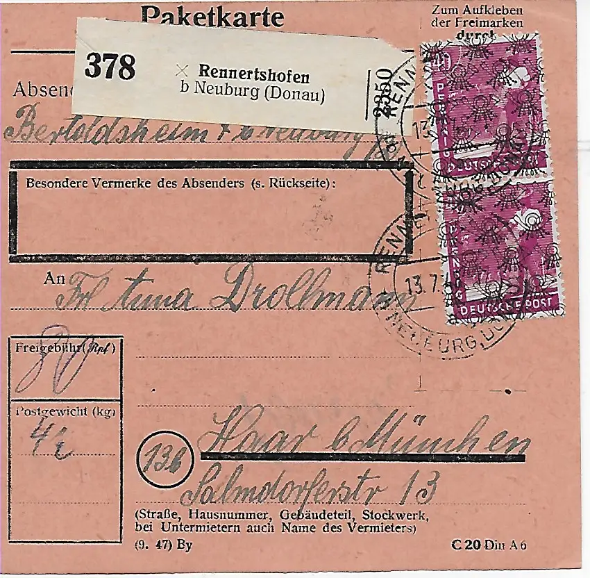 Carte de colis Rennertshofen près de Neuburg vers Haar, 1948, MeF