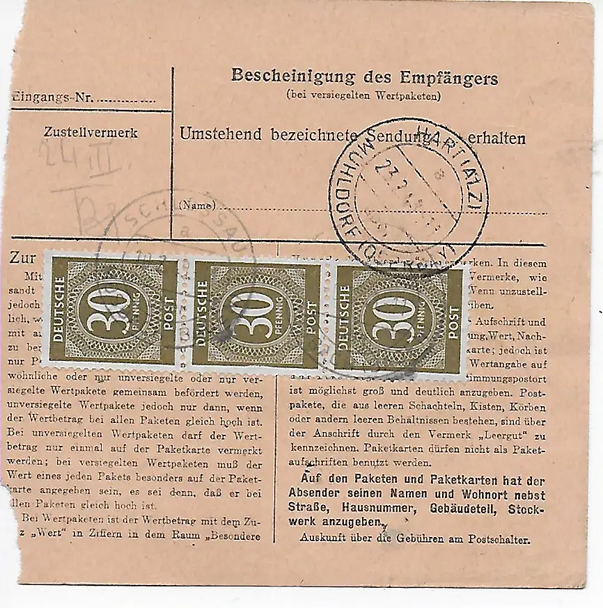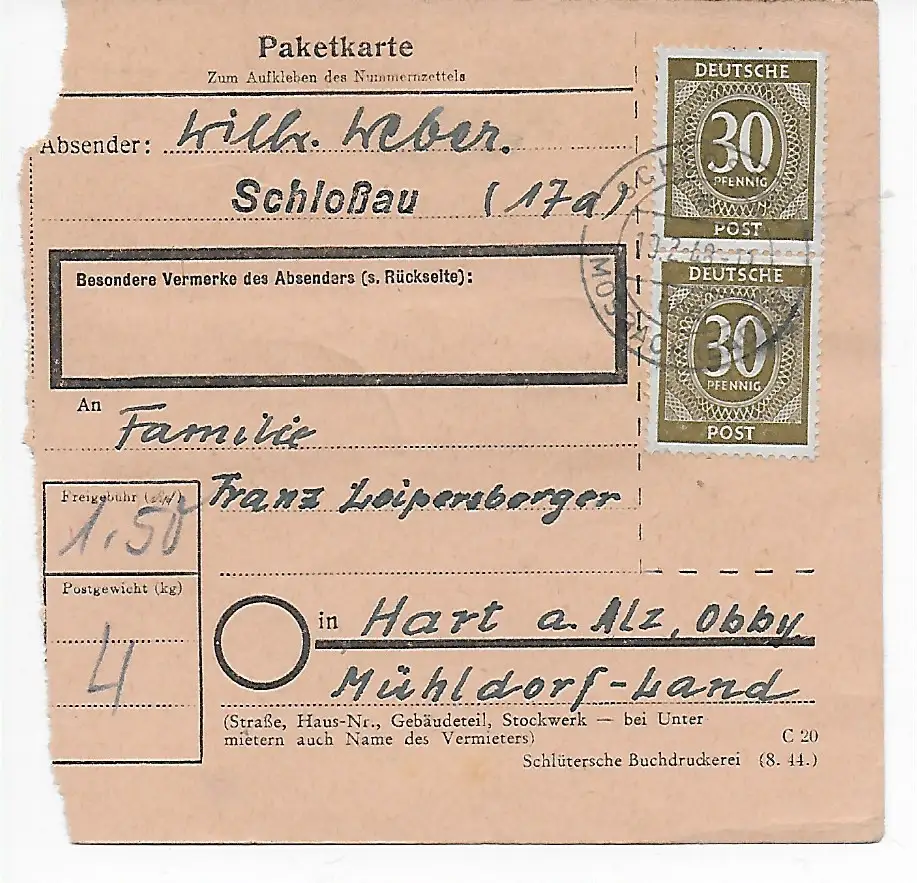Carte colis Schlossau Mosbach vers Hart a. Alz, Mühldorf, 1948, MeF