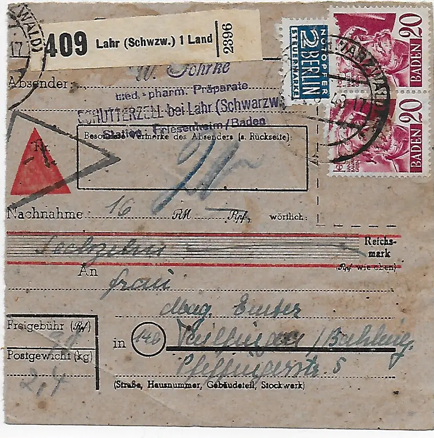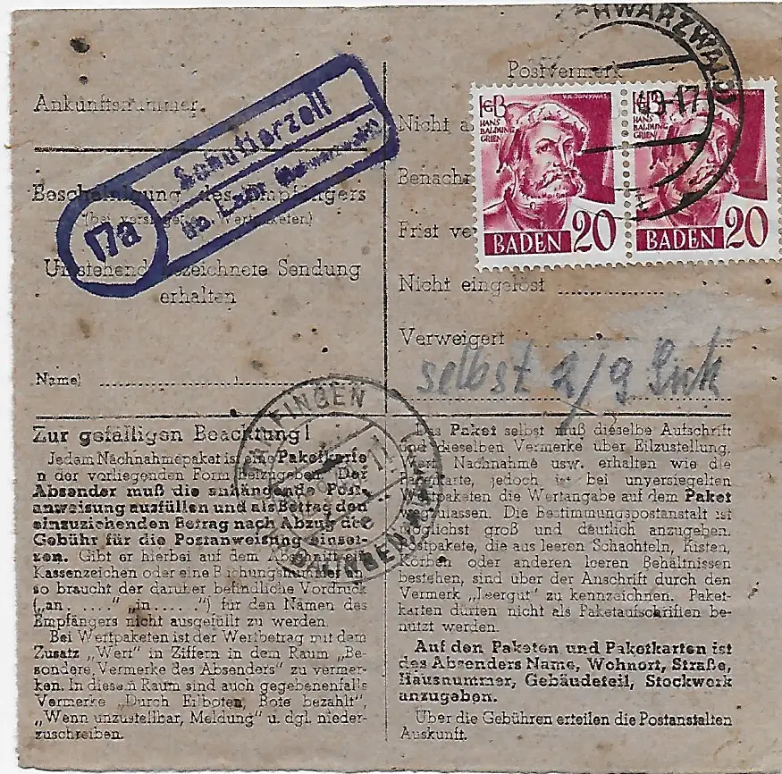 Carte de colis Schüterzell Lahr/Nwarzwald vers Tailfingen, cachet de l'agence