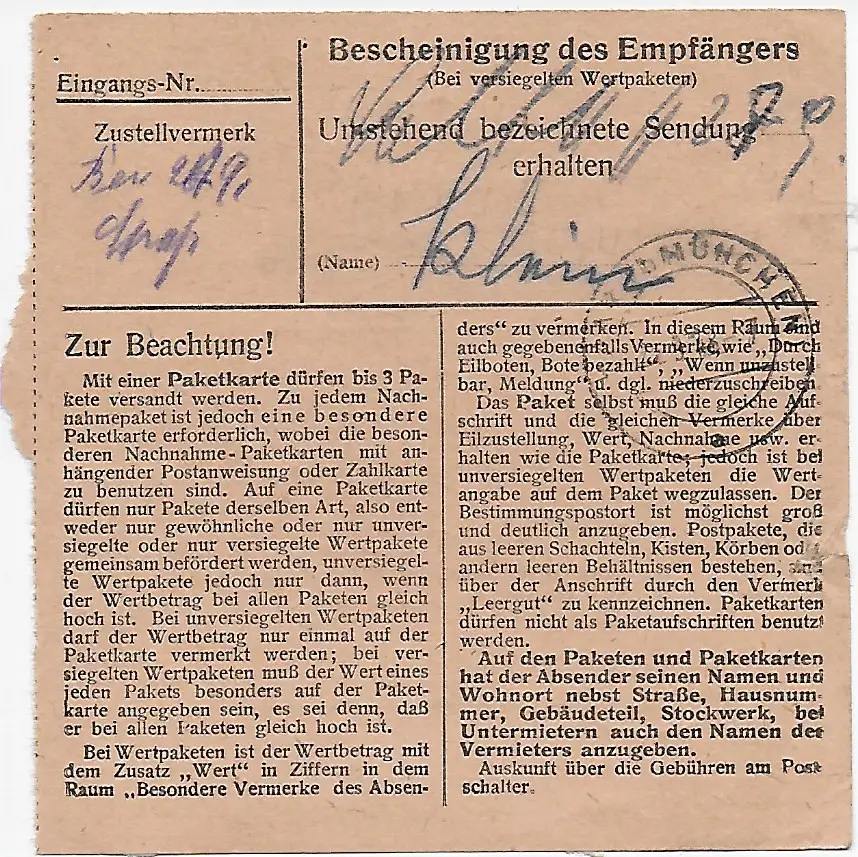 Carte de colis Schwarzhofen/Nabburg vers Haar/Munich, 1948, Min. 94 MeF