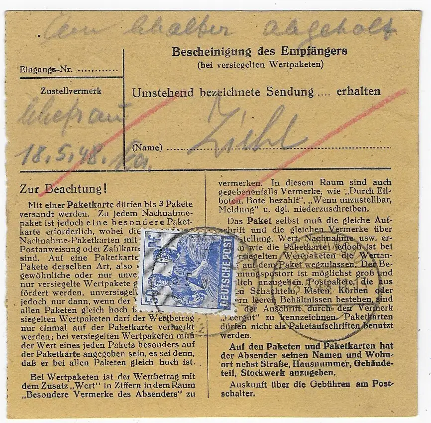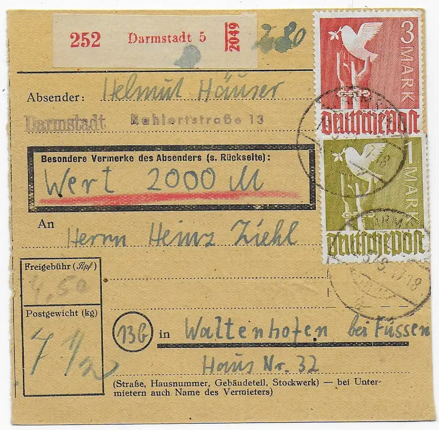 Carte de paquet paquet de valeur de Darmstadt à Waltenhofen/Füssen 1949