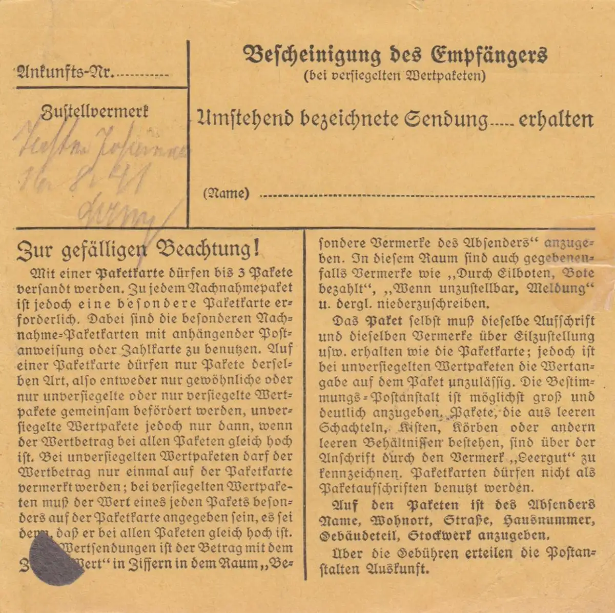 Carte de paquet Würzburg 1941 vers Theilheim