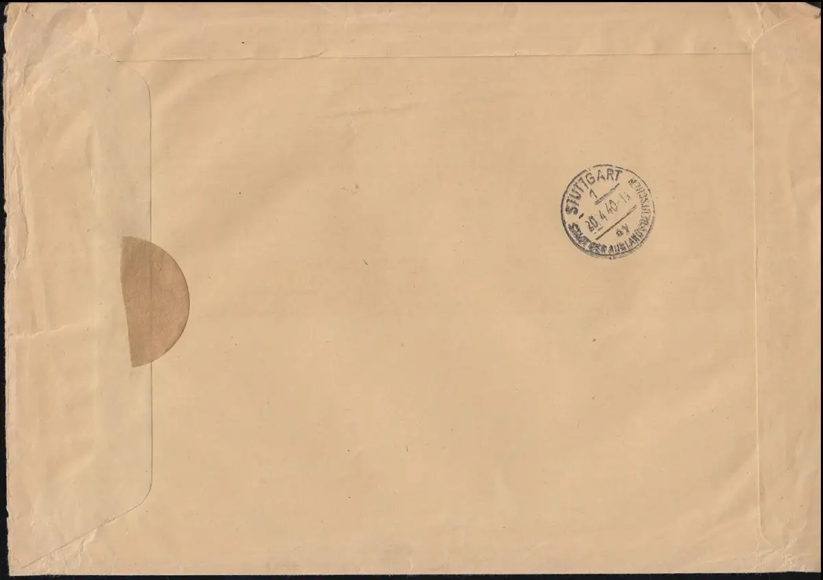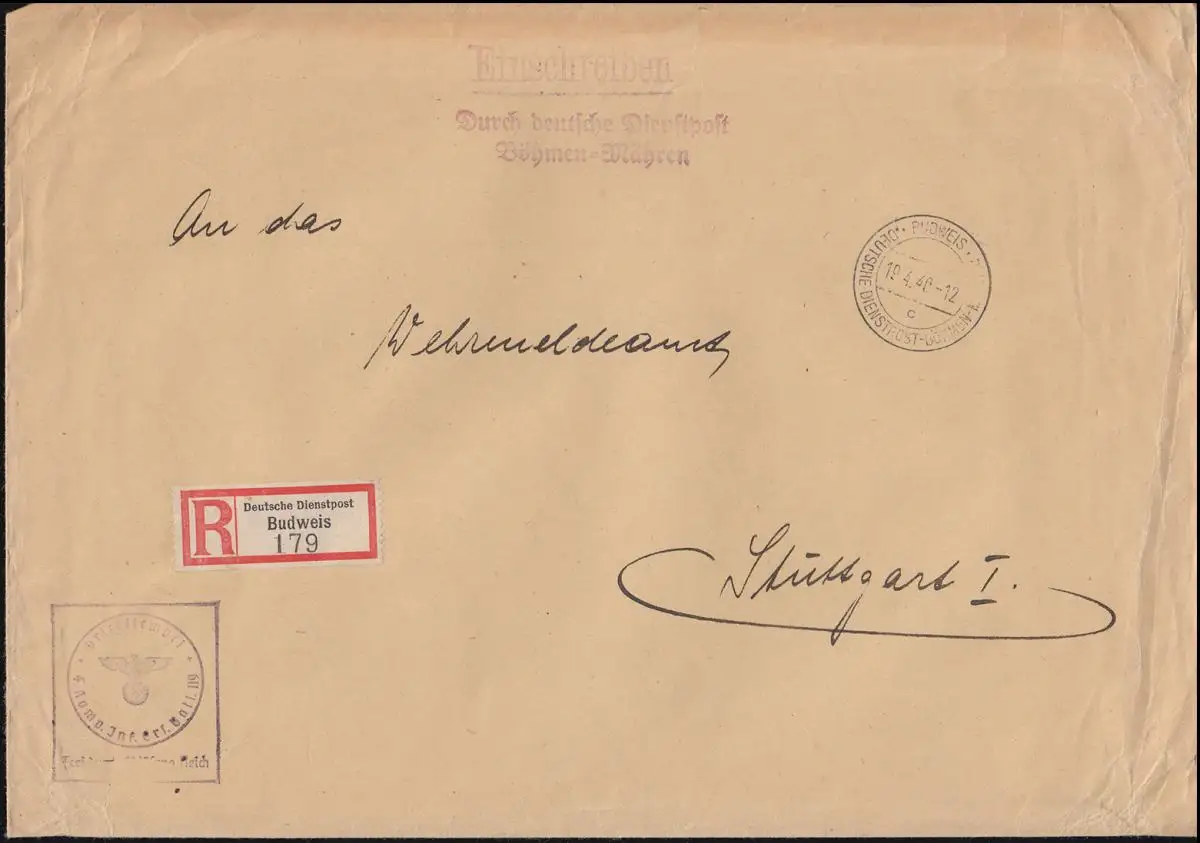 Par l'Office fédéral allemand de la fonction publique de Bohême=Mähren R-Bf. Budweis 19.4.40 selon STUTTGART