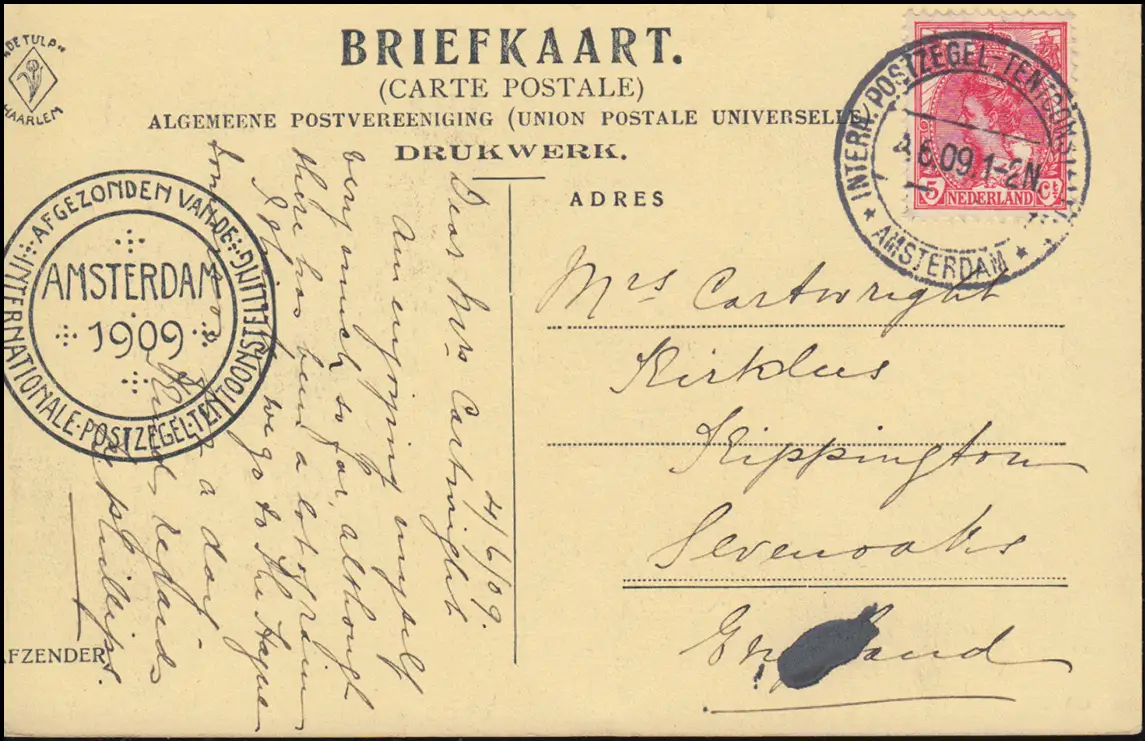 Pays-Bas AK Ancienne façade, exposition de timbres SSt AMSTERDAM 4.6.1909