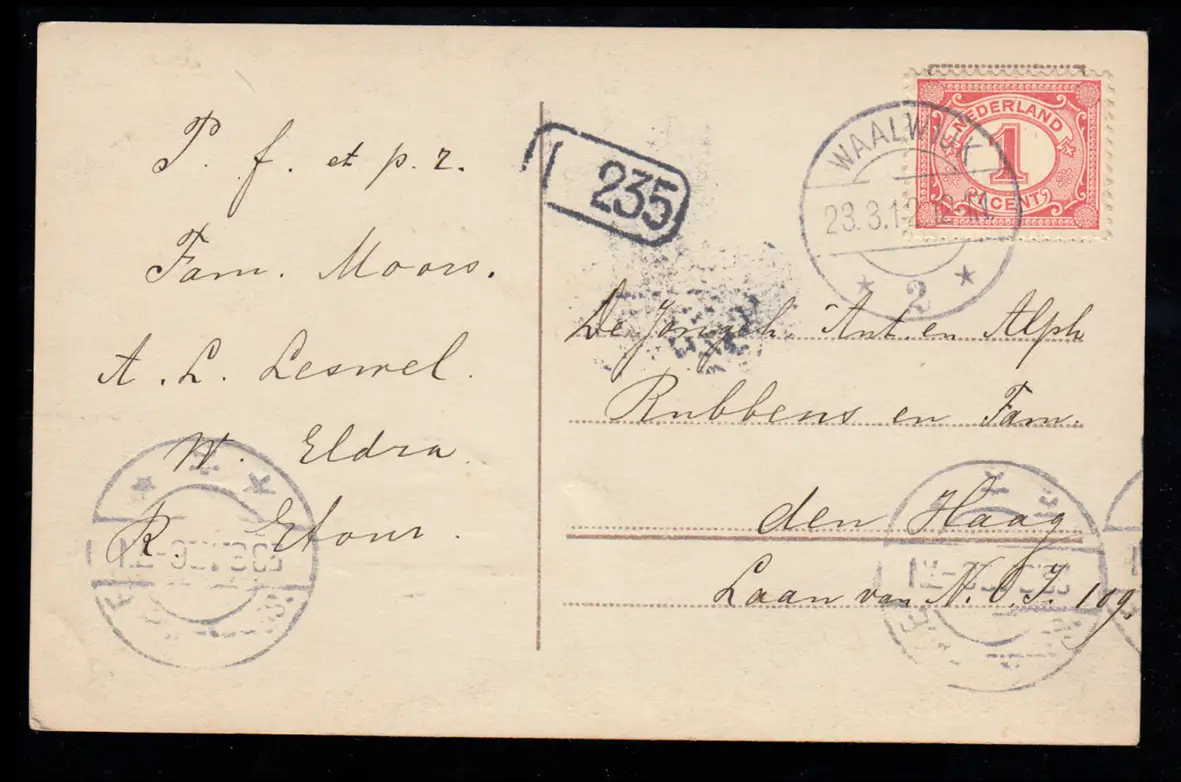 Tampon d'arrivée S'GRAVENHAGE / DEN HAAG 23.3.1912 Vérification: original Référence produit: 00000000001413>Note: Cet article n'est disponible qu'une seule fois. Vous recevrez exactement l'article représenté.