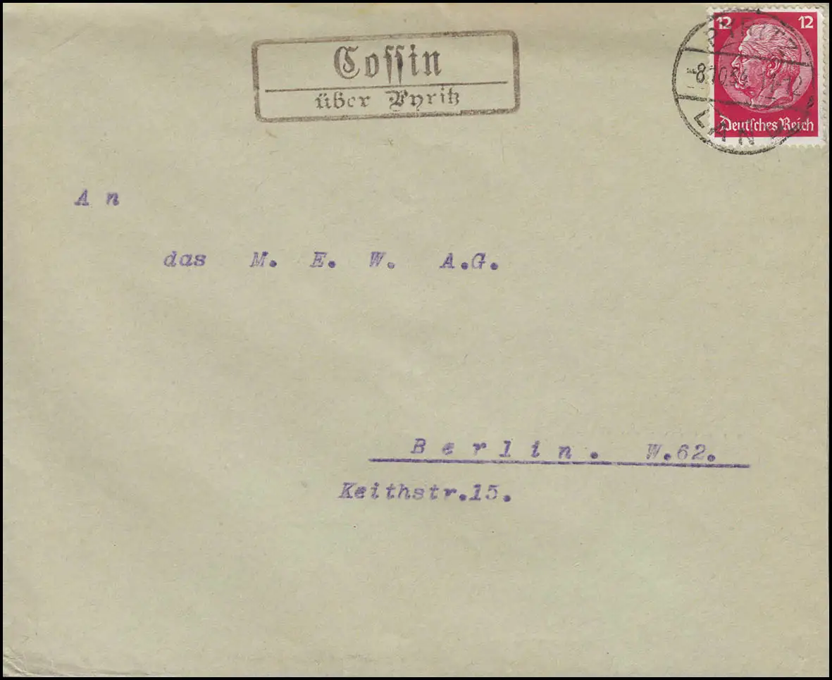 Pays-Bas: COSSIN /Kosin via PYRITZ / Pyrzyce 8.10.1935 sur lettre à BERLIN