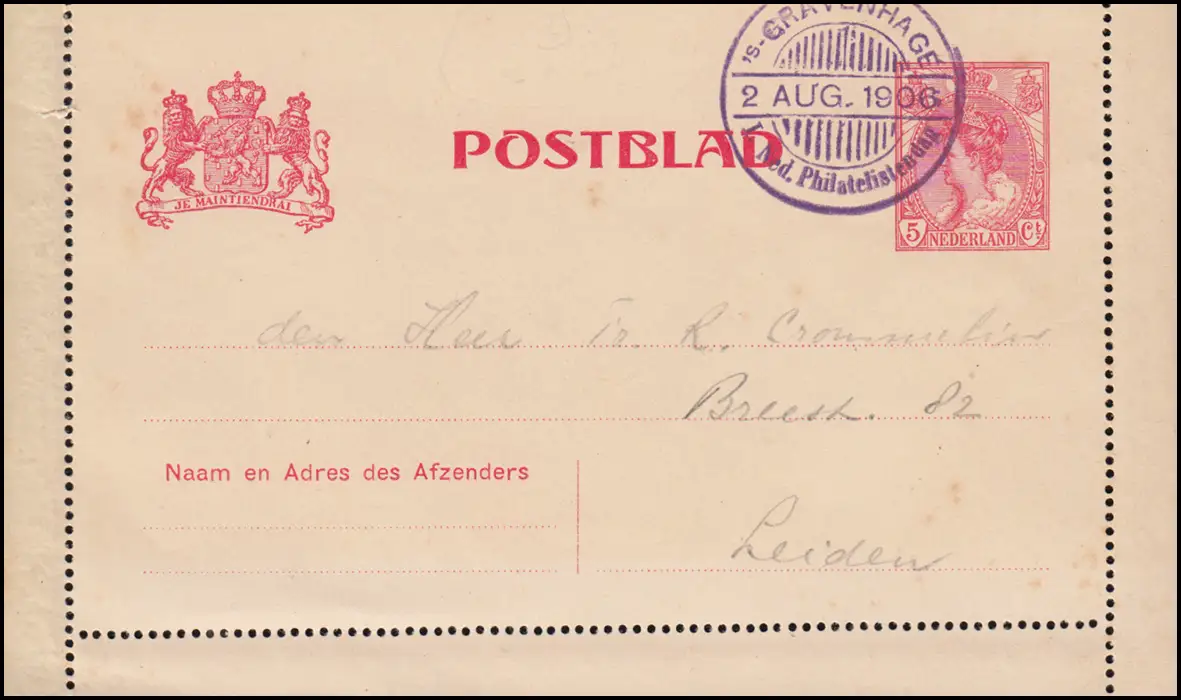 Pays-Bas Cartes de crédit K 9 avec SSt s'GRAVENHAGE 1er jour de philatéliste 2.8.1906
